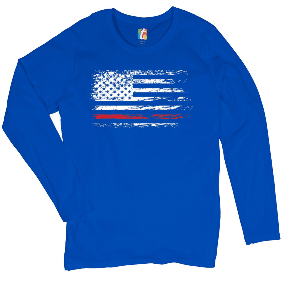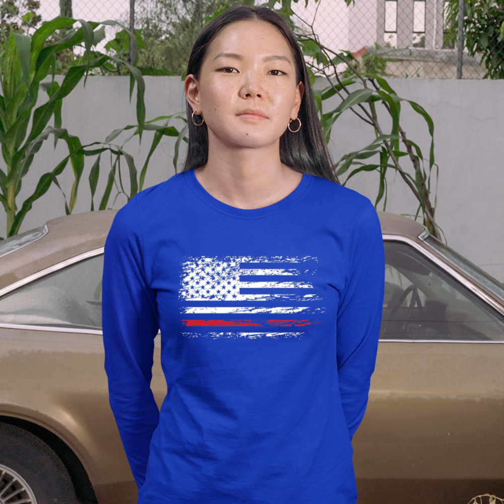 DISTRESSED AMERICAN FLAG women's long sleeve t-shirt thind red line firefighter royal blue