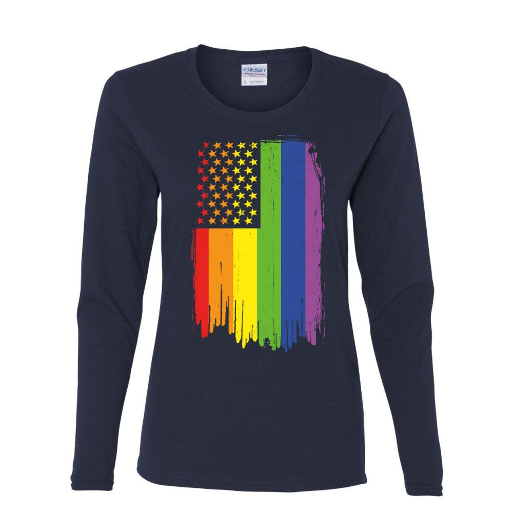 DISTRESSED GAY PRIDE RAINBOW FLAG long sleeve t-shirt lgbtq love wins navy blue