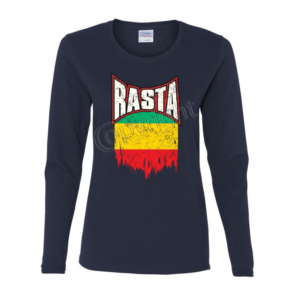 DISTRESSED RASTA FLAG women's long sleeve tee smoking 420 reggae marijuana weed navy blue