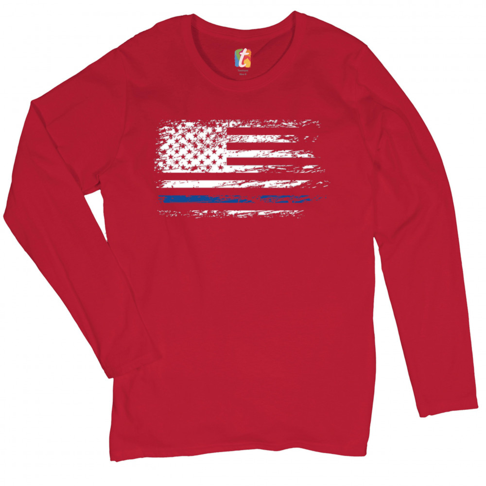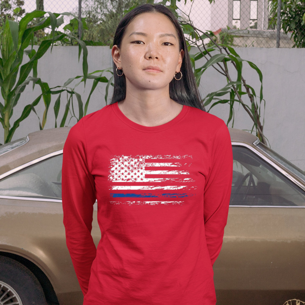 DISTRESSED THIN BLUE LINE AMERICAN FLAG women's long sleeve t-shirt police red