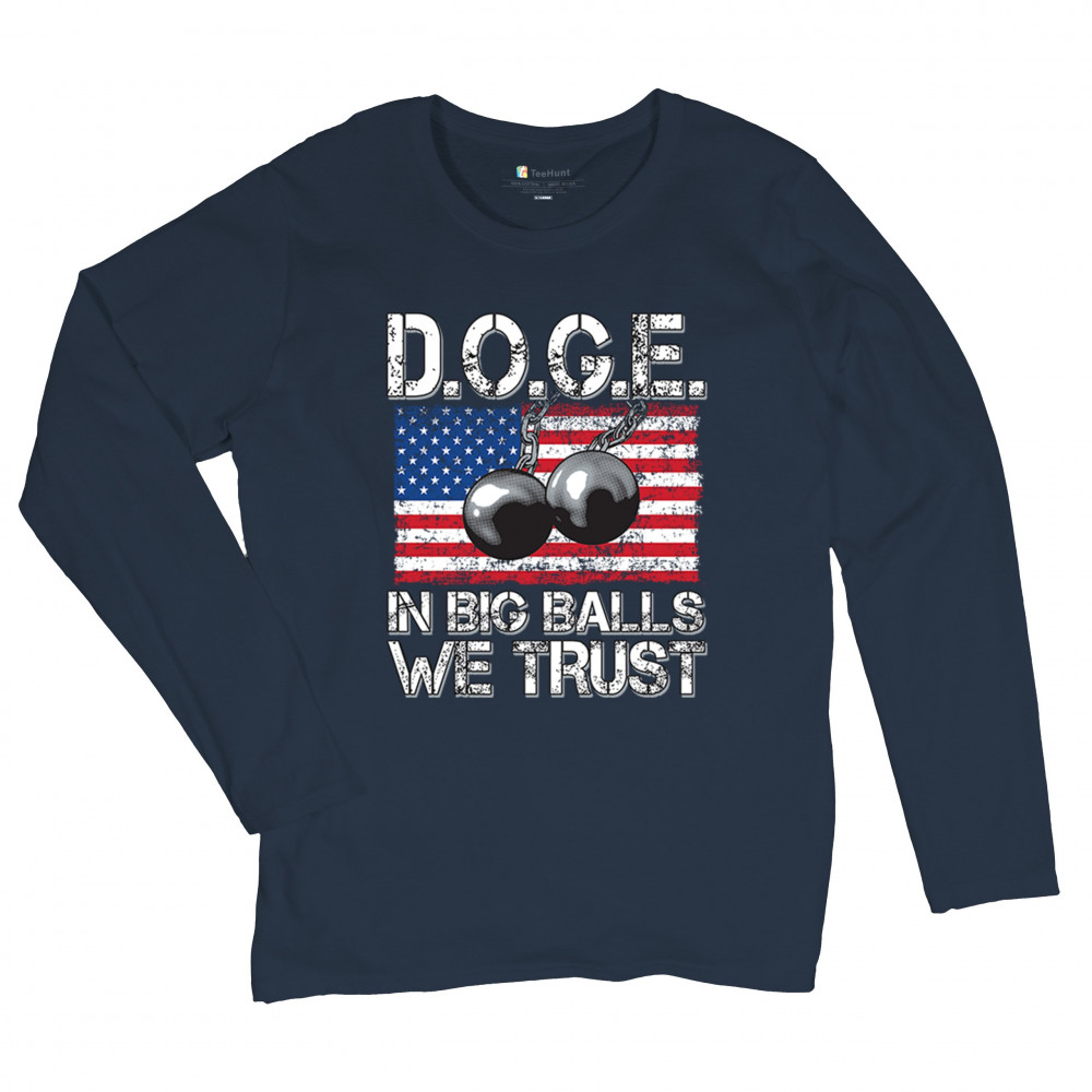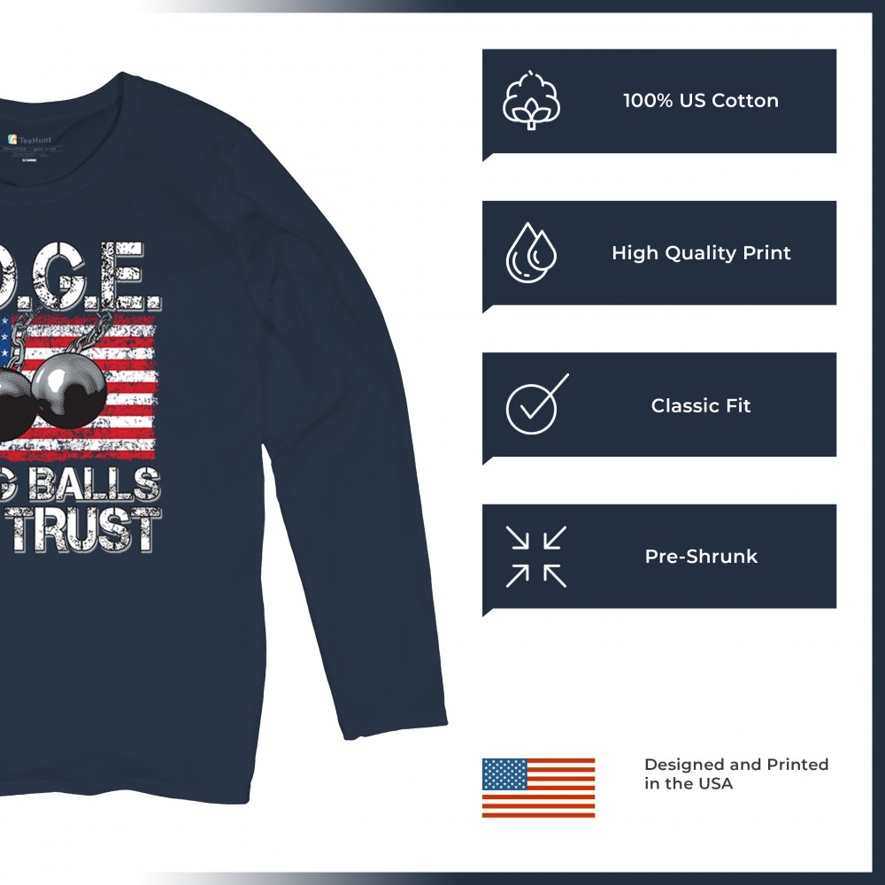 The D.O.G.E. In Big Balls We Trust design blends patriotic grit with sharp political satire. Featuring chained wrecking balls over a distressed American flag, this graphic hits hard. Perfect for conservative men, bold personalities, and political events like rallies, debates, and meetups.