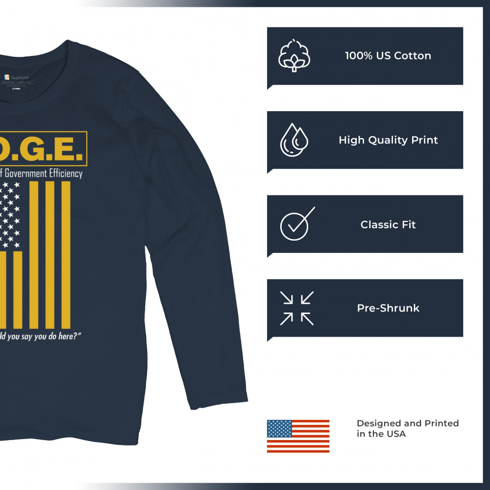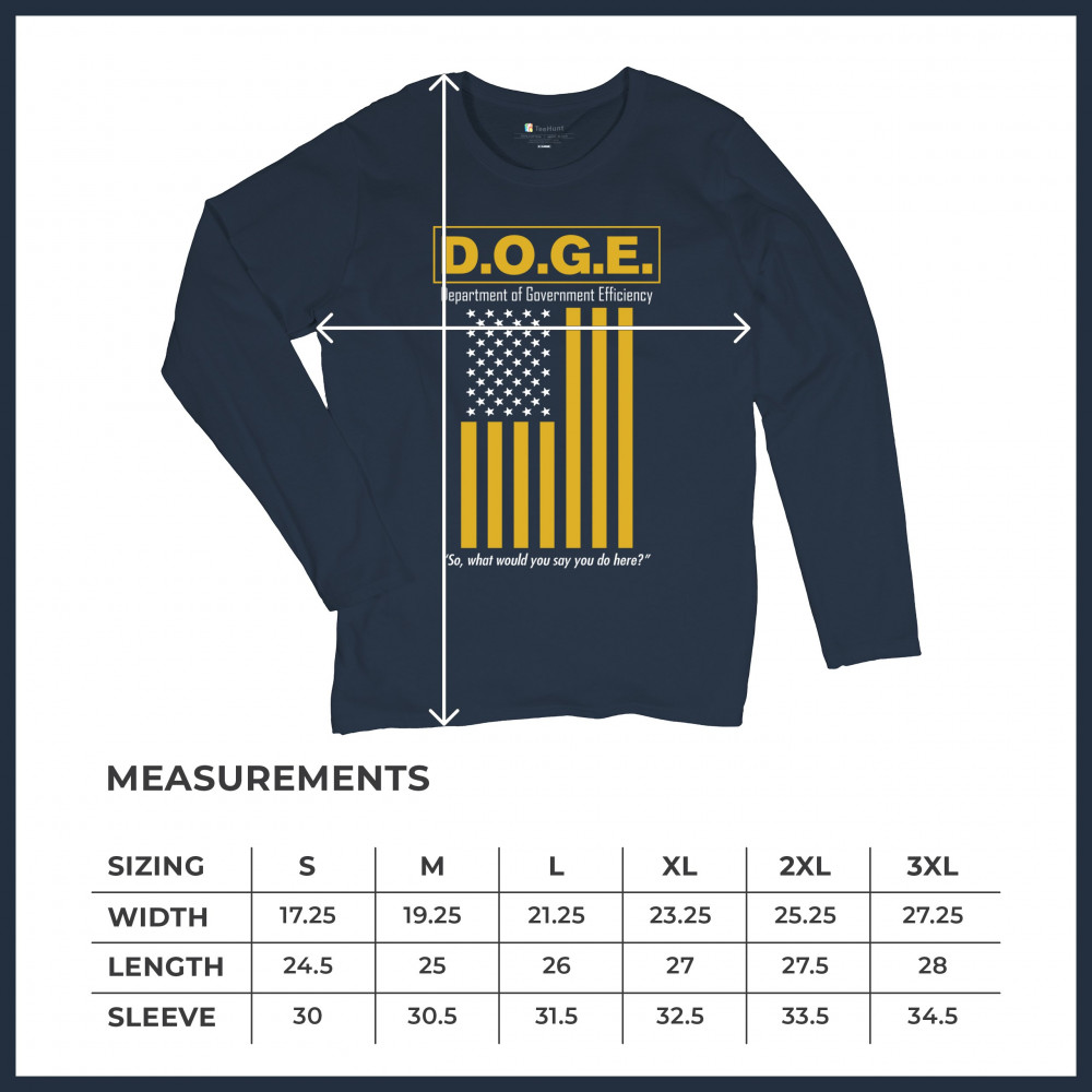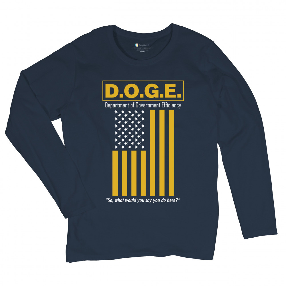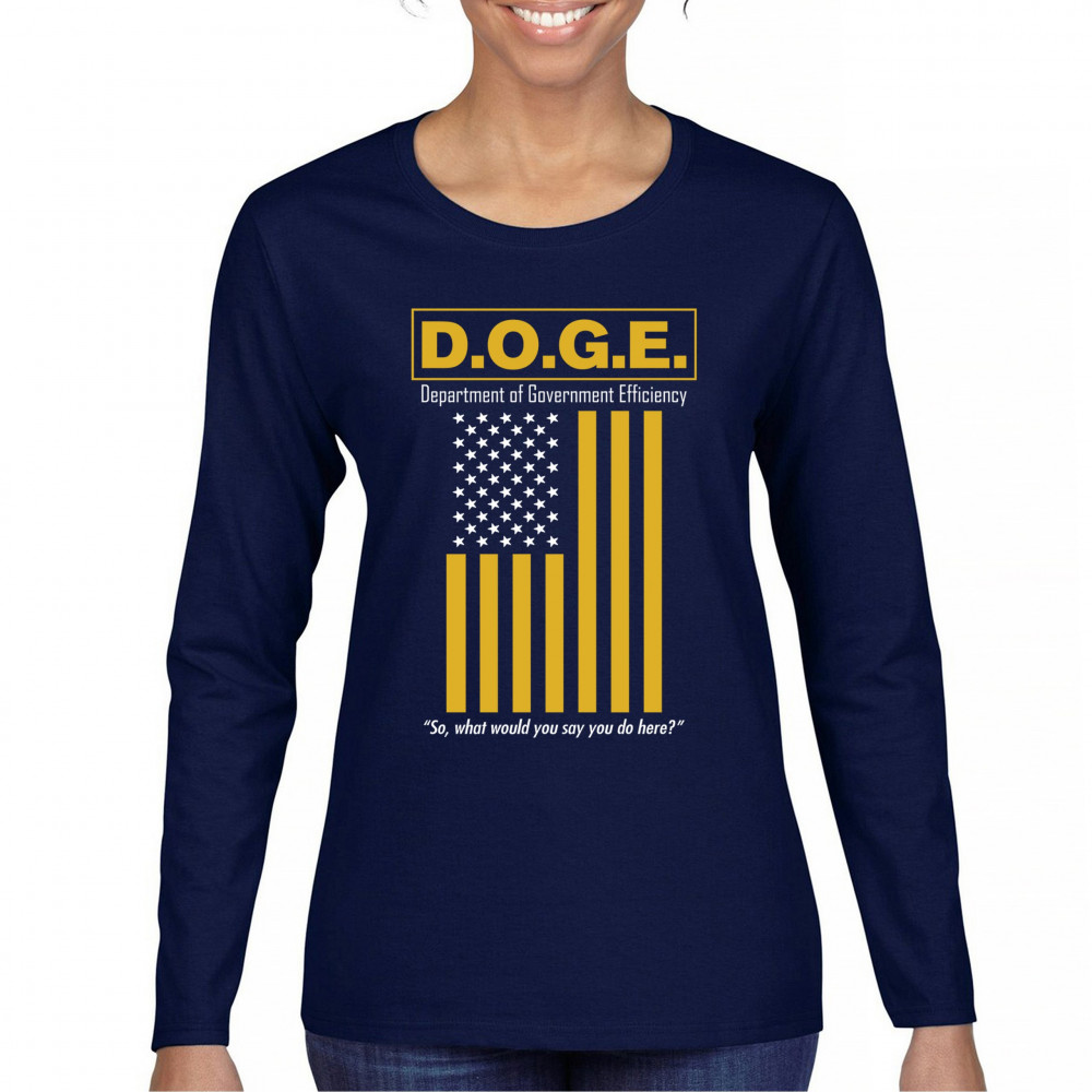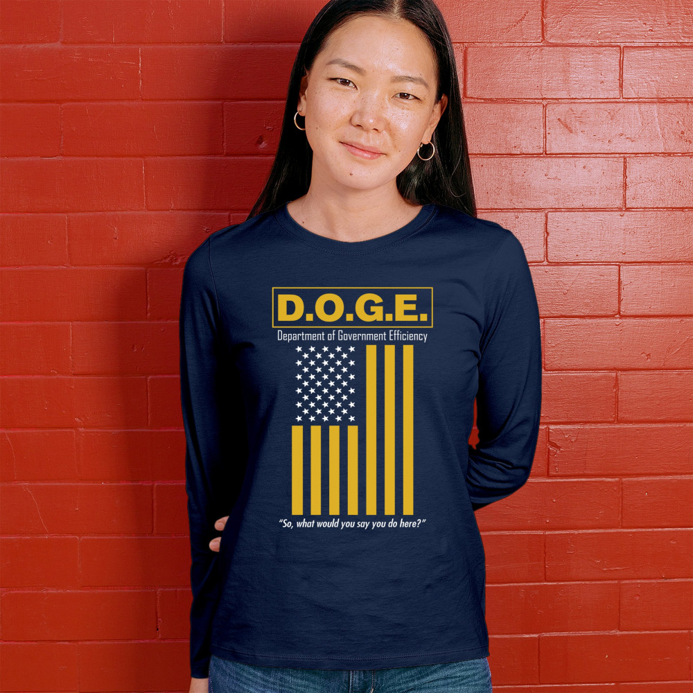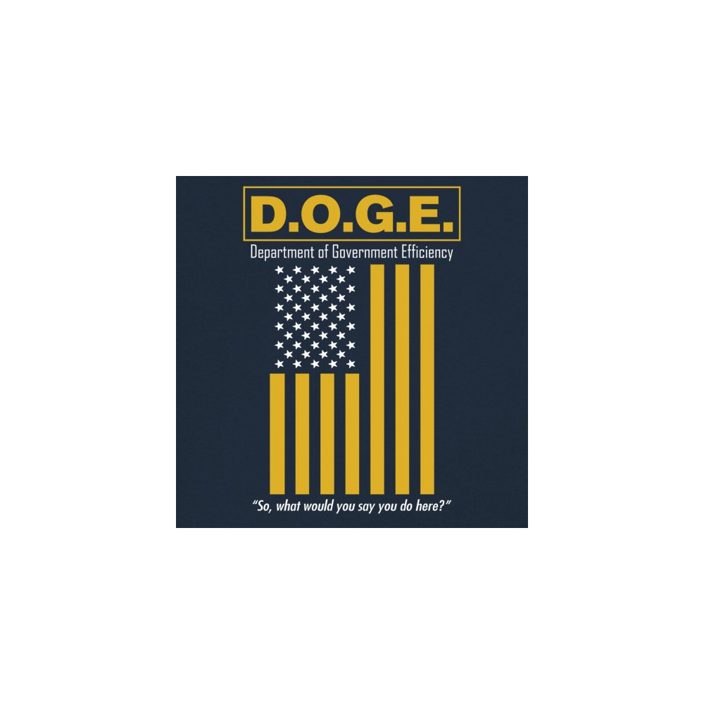 The D.O.G.E. Department of Government Efficiency design features bold yellow lettering and a sarcastic punchline aimed at bloated systems. Clean typography paired with a reimagined American flag gives this political parody retro appeal. Ideal for libertarians, patriots, or anyone fed up with inefficiency and red tape.