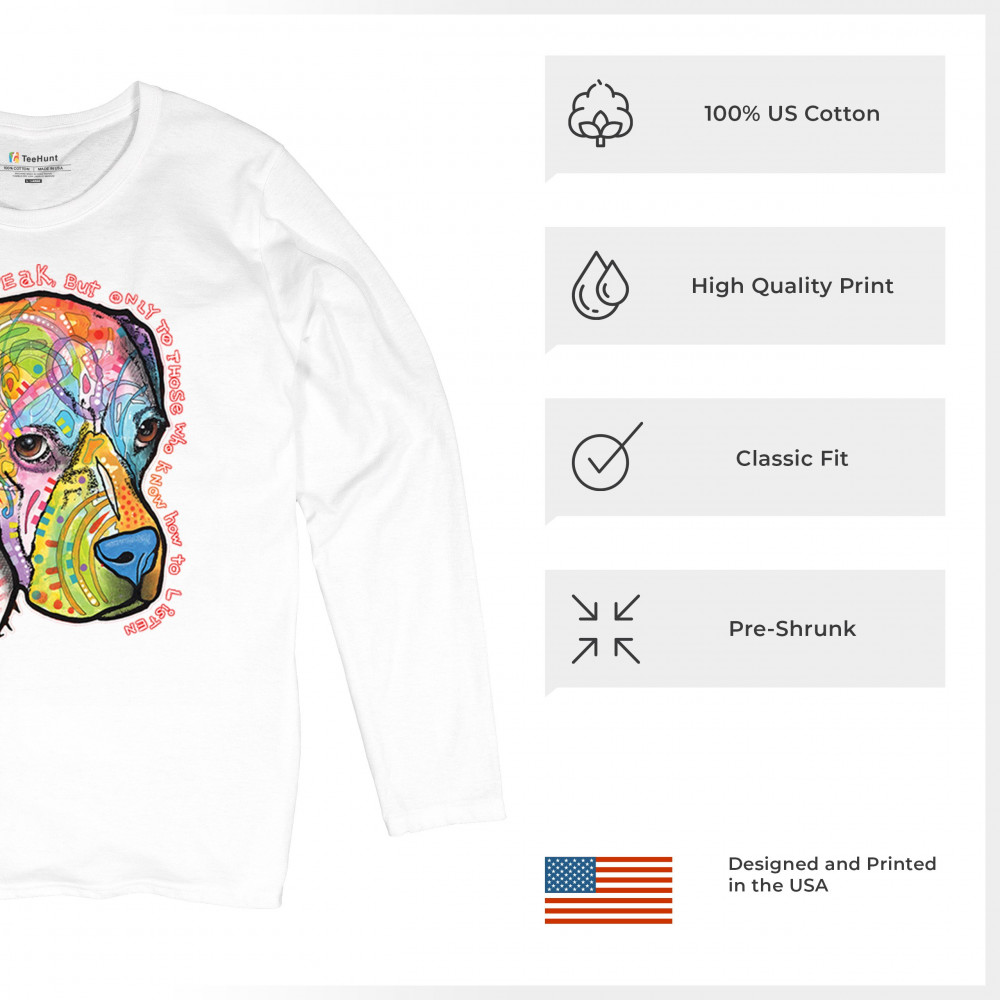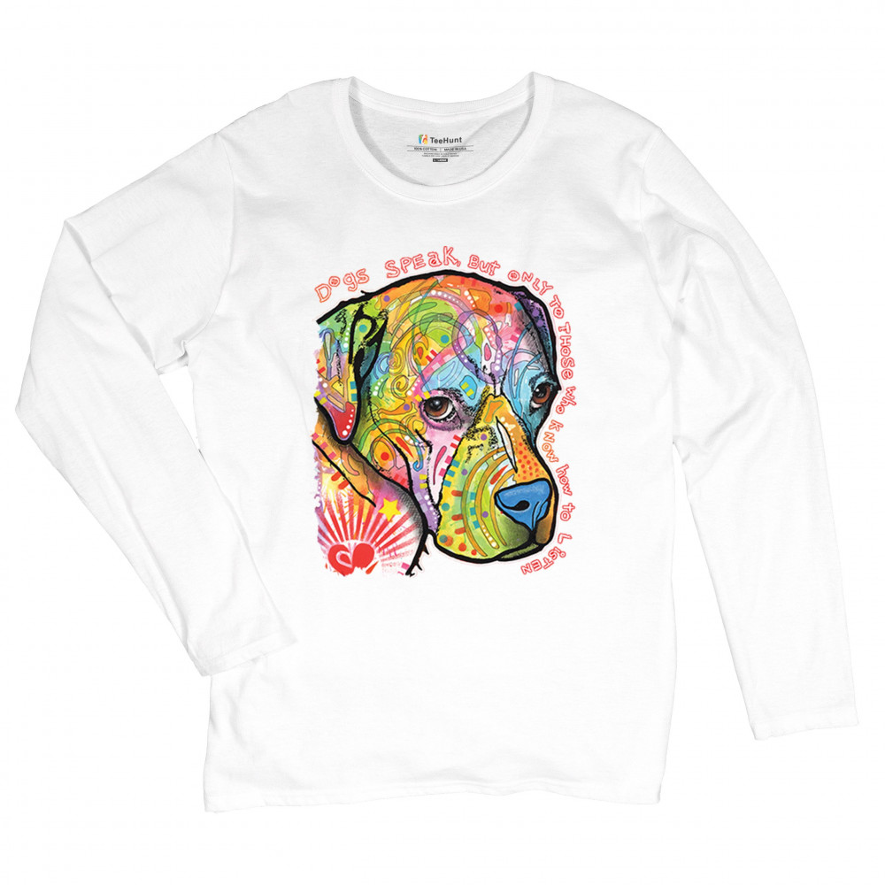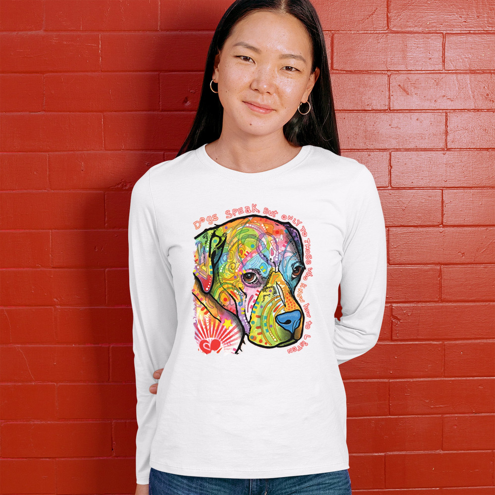 DOGS SPEAK TO THOSE WHO LISTEN women's long sleeve t-shirt dean russo neon pet white
