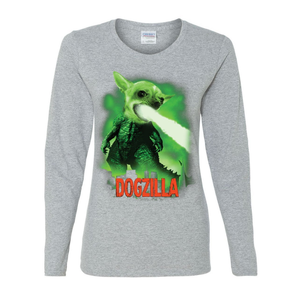 DOGZILLA FUNNY women's long sleeve tee movie parody dog pet lovers atomic breath gray