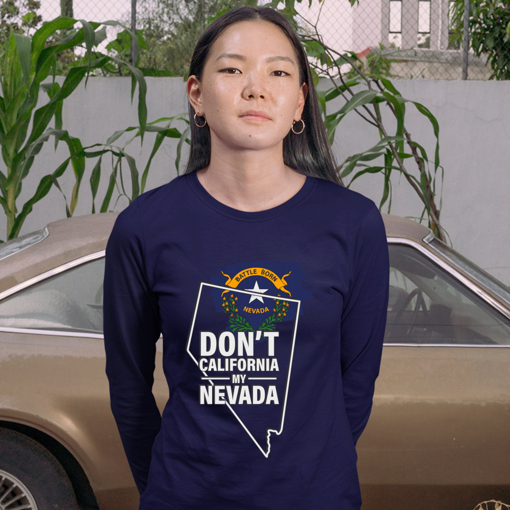 DON'T CALIFORNIA MY NEVADA women's long sleeve t-shirt the battle born state navy blue