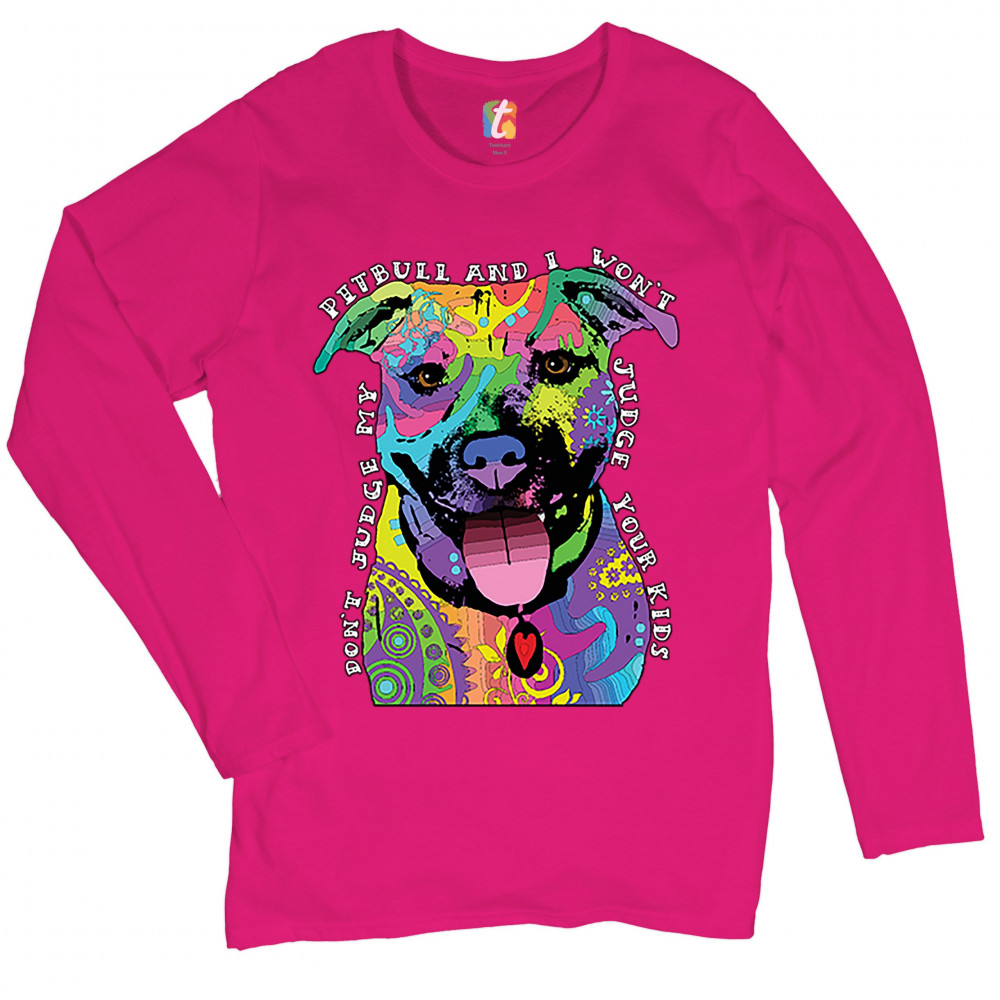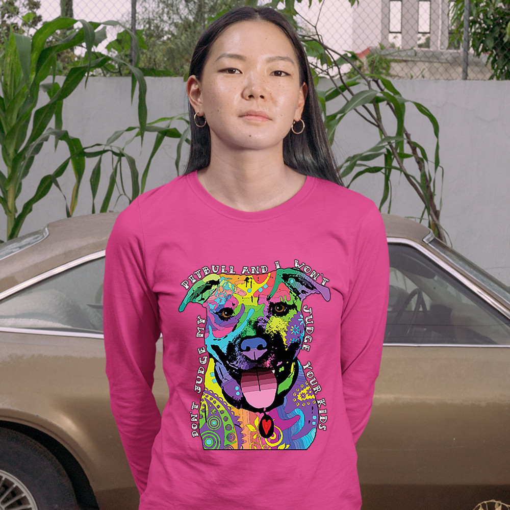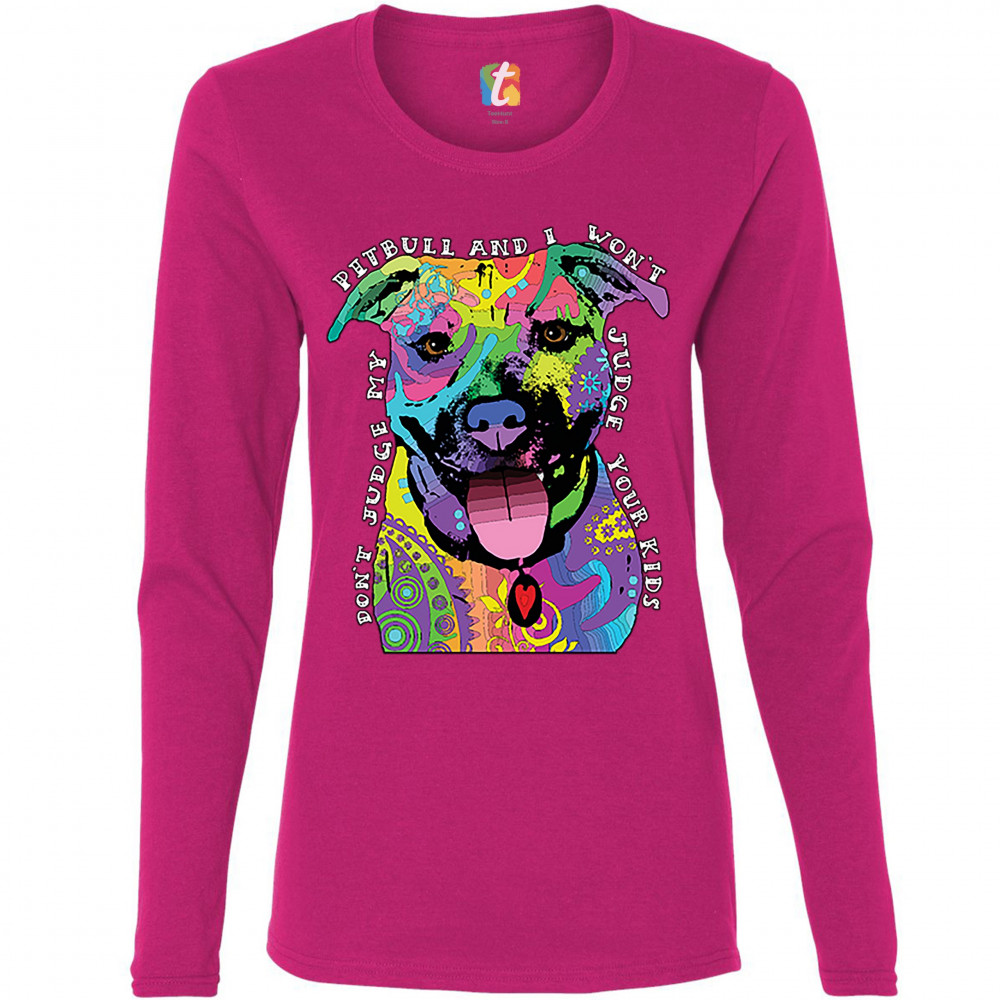 DON'T JUDGE MY PIT BULL women's long sleeve t-shirt funny andy maxx dog lover pink