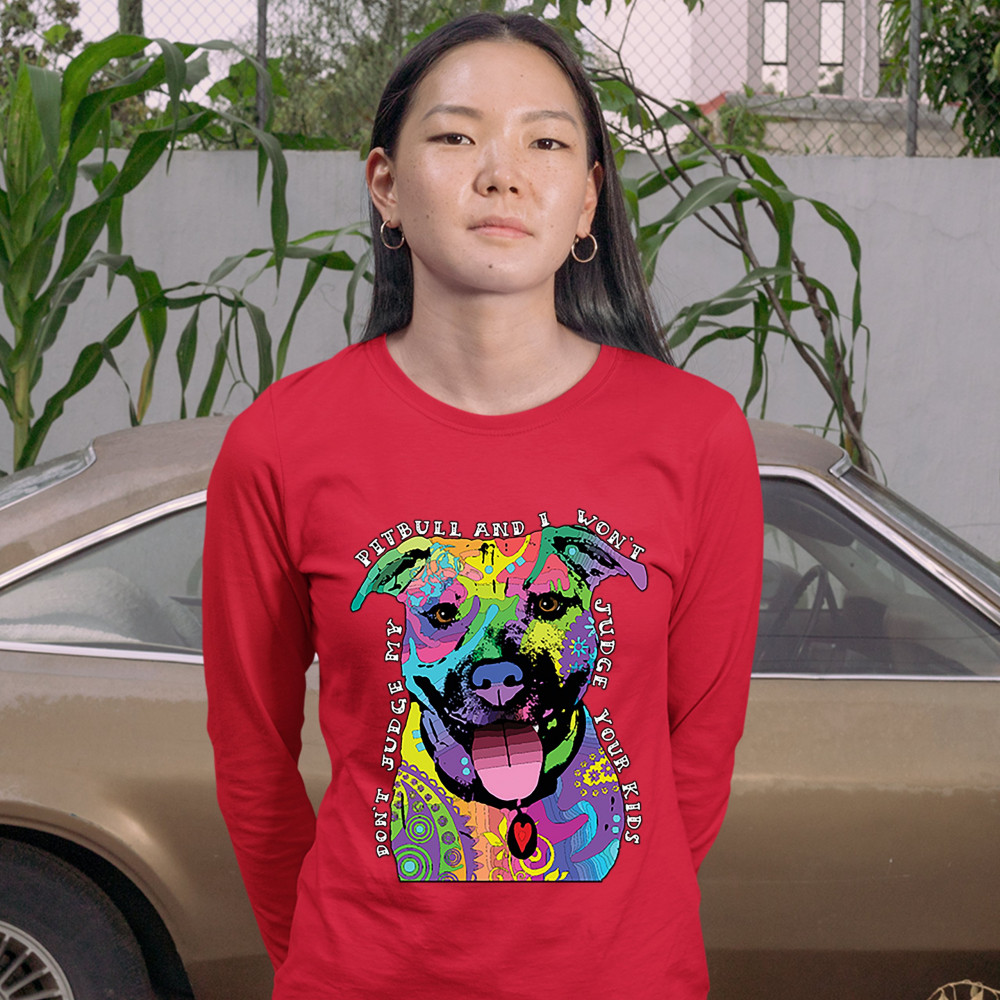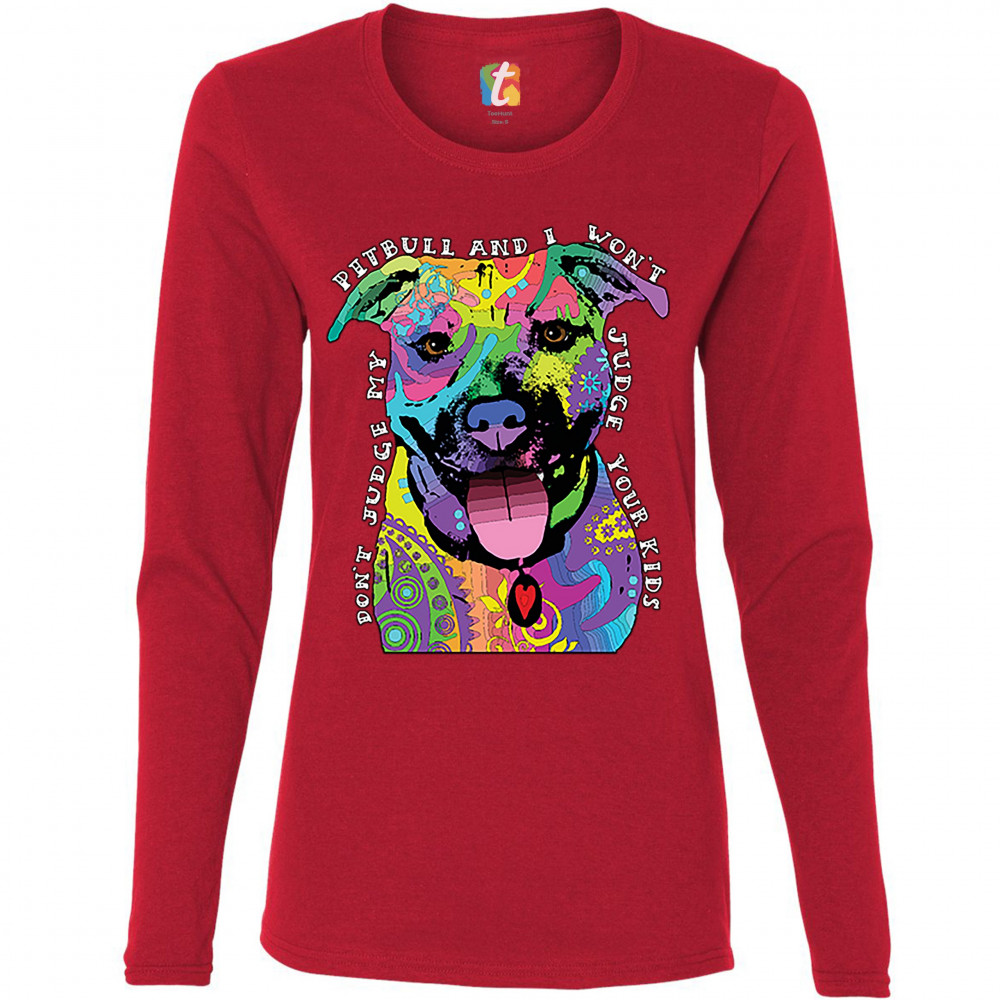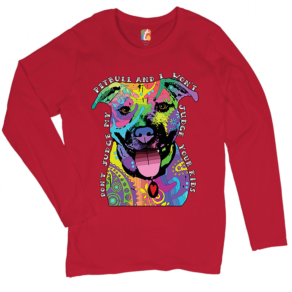 DON'T JUDGE MY PIT BULL women's long sleeve t-shirt funny andy maxx dog lover red