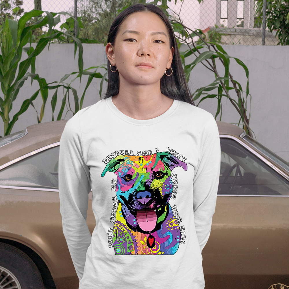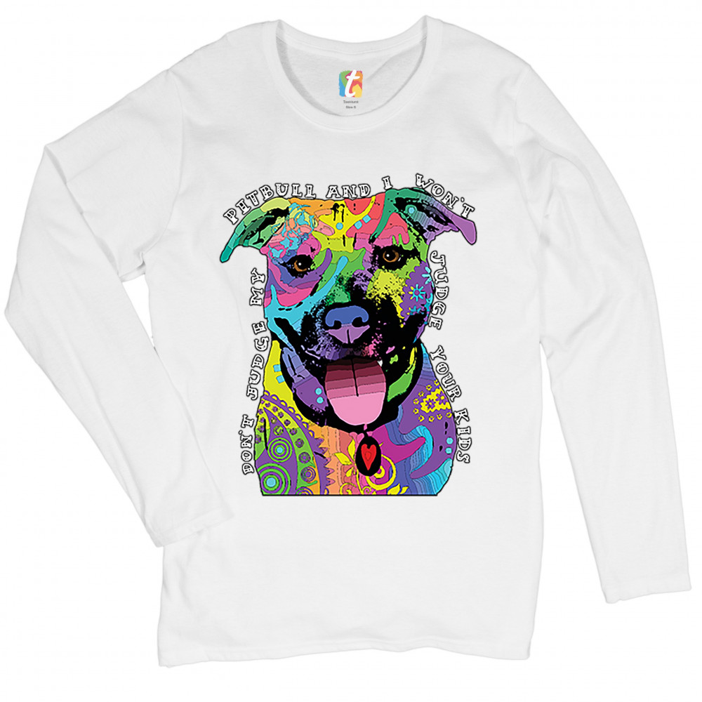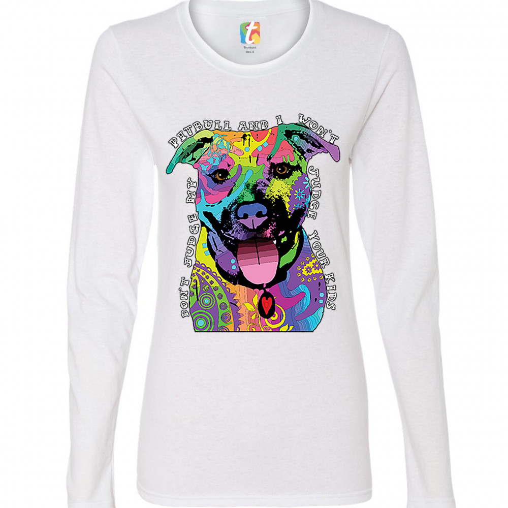 DON'T JUDGE MY PIT BULL women's long sleeve t-shirt funny andy maxx dog lover white