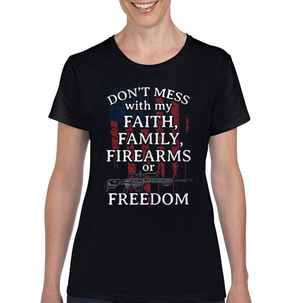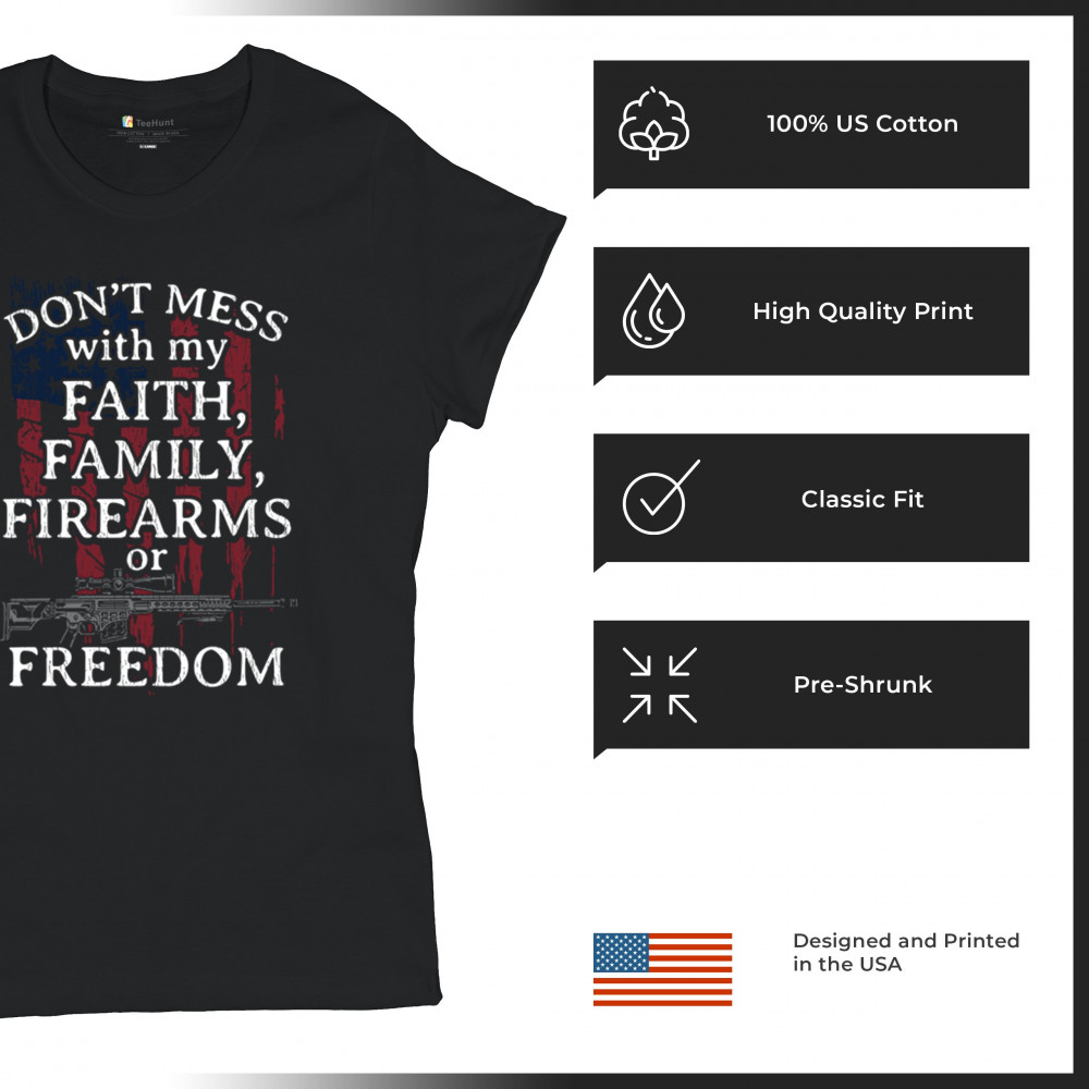 Patriotic shirt with "Don't Mess with My Faith, Family, Firearms, or Freedom" over distressed American flag. Perfect for patriots and veterans.