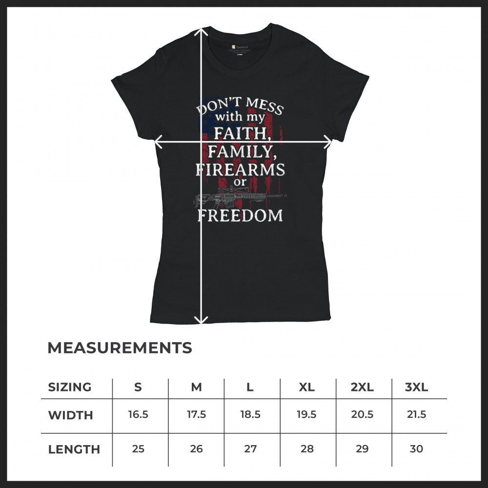 Celebrate your patriotism and core values with this powerful shirt featuring "Don't Mess with My Faith, Family, Firearms, or Freedom" set against a distressed American flag. This shirt is perfect for patriots, veterans, and those who hold their religious beliefs and the right to bear arms in high regard. Made from high-quality fabric, it ensures comfort and durability for everyday wear. Wear it proudly at patriotic events, on the 4th of July, or anytime you want to make a strong statement about your beliefs. It’s an excellent gift for anyone who shares these values and supports the American flag and the stars and stripes.