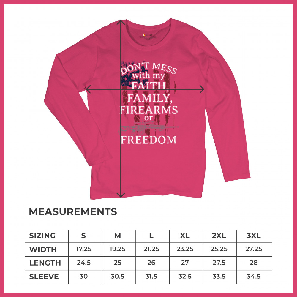 Celebrate your patriotism and core values with this powerful shirt featuring "Don't Mess with My Faith, Family, Firearms, or Freedom" set against a distressed American flag. This shirt is perfect for patriots, veterans, and those who hold their religious beliefs and the right to bear arms in high regard. Made from high-quality fabric, it ensures comfort and durability for everyday wear. Wear it proudly at patriotic events, on the 4th of July, or anytime you want to make a strong statement about your beliefs. It’s an excellent gift for anyone who shares these values and supports the American flag and the stars and stripes.