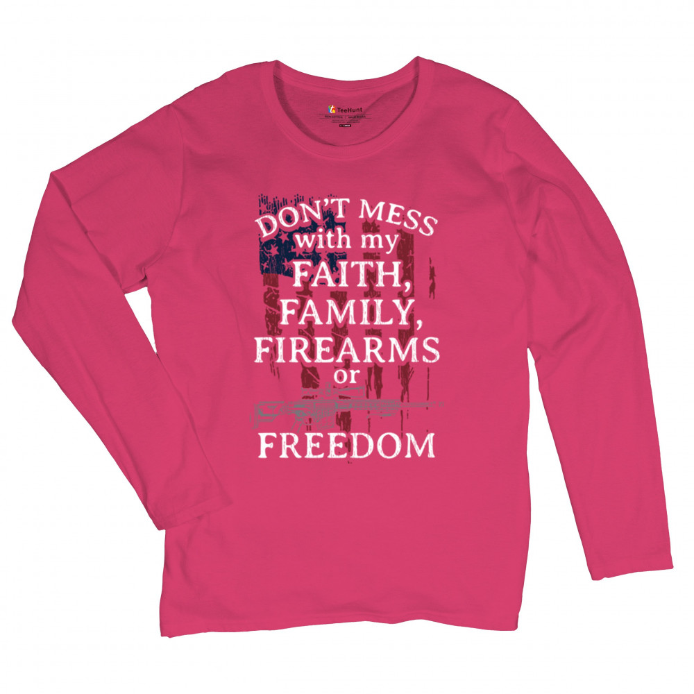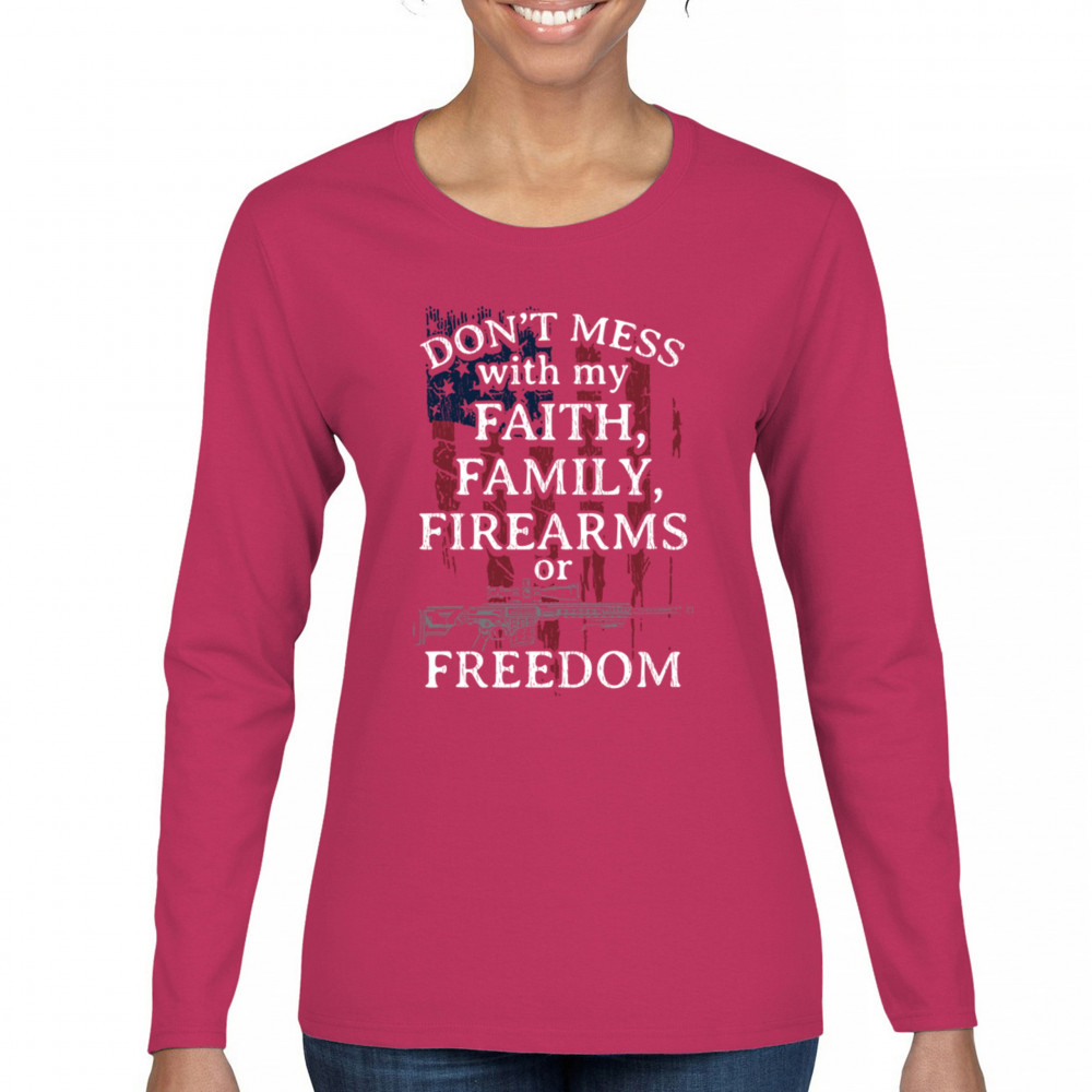 Patriotic shirt with "Don't Mess with My Faith, Family, Firearms, or Freedom" over distressed American flag. Perfect for patriots and veterans.