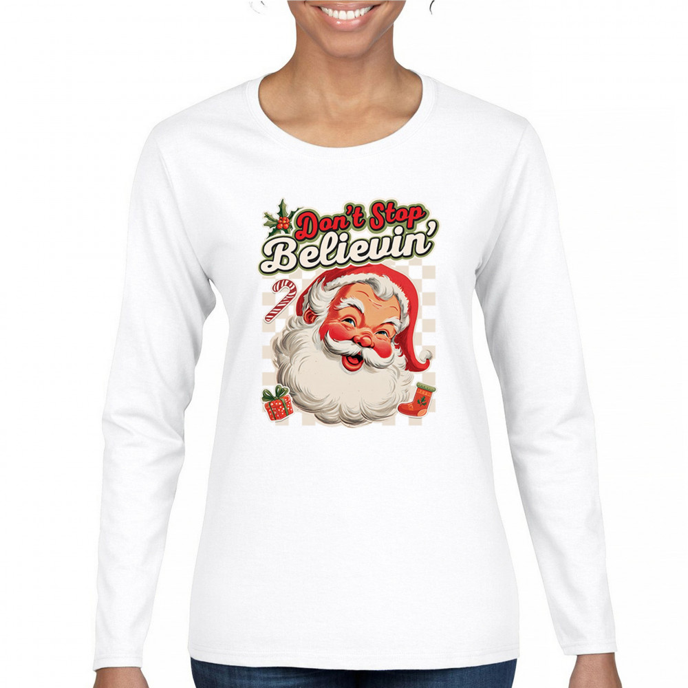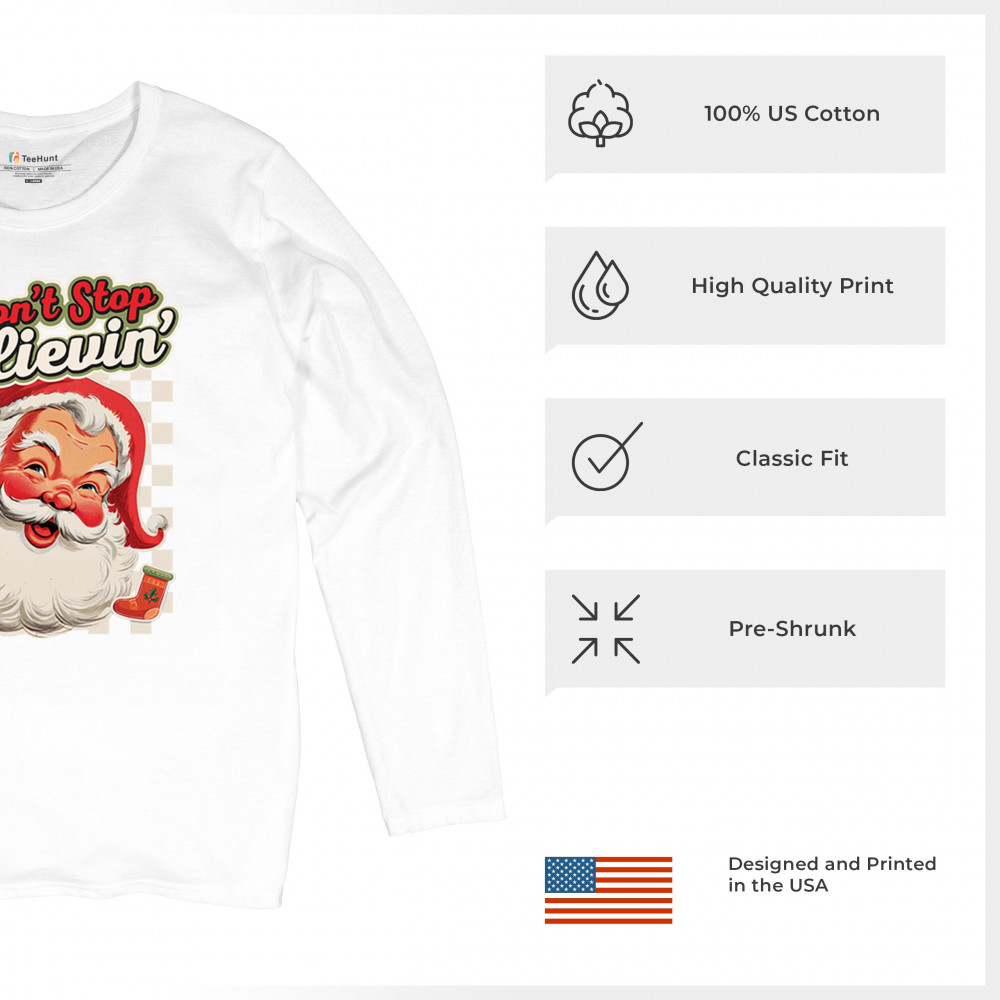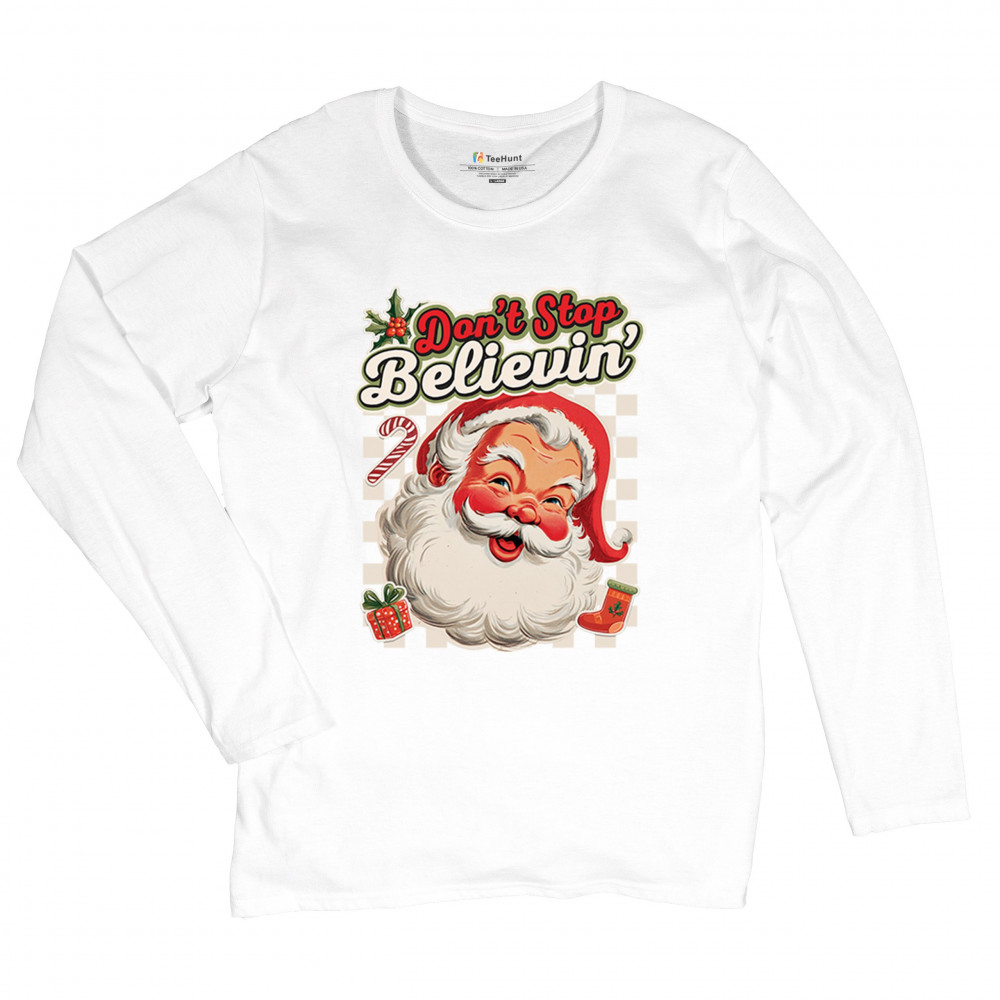 Spread holiday cheer with this “Don’t Stop Believing†Santa Claus shirt that blends classic Christmas spirit with cozy winter charm. Perfect for festive parties, family gatherings, or relaxing by the fire, this design captures Jingle Bells joy, Merry Xmas fun, Santa Claus magic, Reindeer delight, Rudolph glow, Snowman charm, and Christmas tree style for the perfect seasonal outfit.