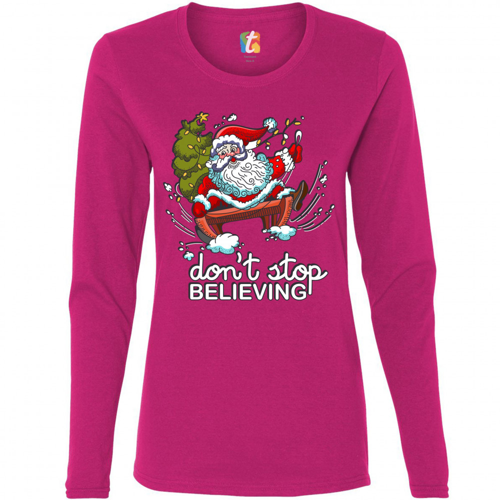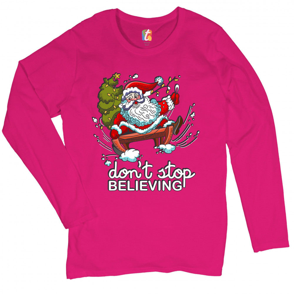 DON'T STOP BELIEVING women's long sleeve t-shirt holiday spirit santa claus pink