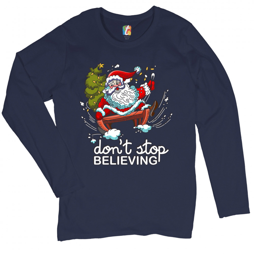 DON'T STOP BELIEVING women's long sleeve t-shirt holiday spirit santa claus navy blue