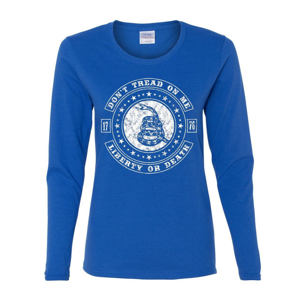 DON'T TREAD ON ME LIBERTY OR DEATH don't tread on me women's long sleeve tee liberty or death gadsden rattlesnake royal blue