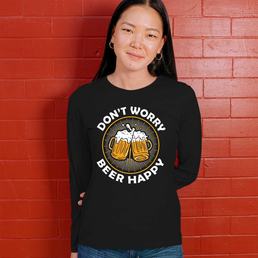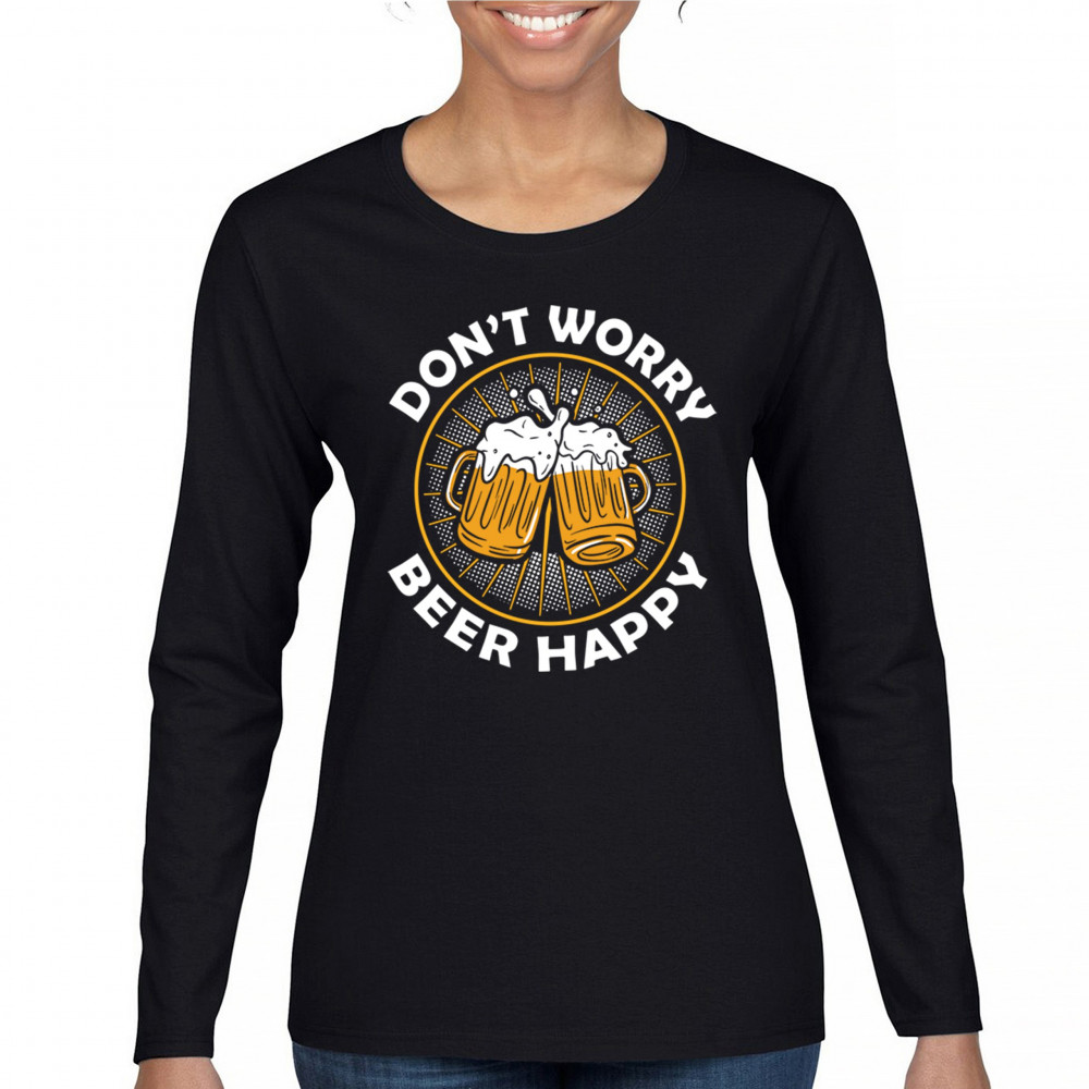 DON'T WORRY BEER HAPPY women's long sleeve t-shirt fun drinking craft brew ipa black