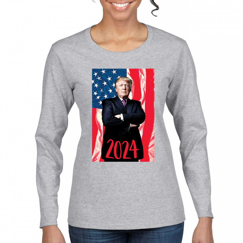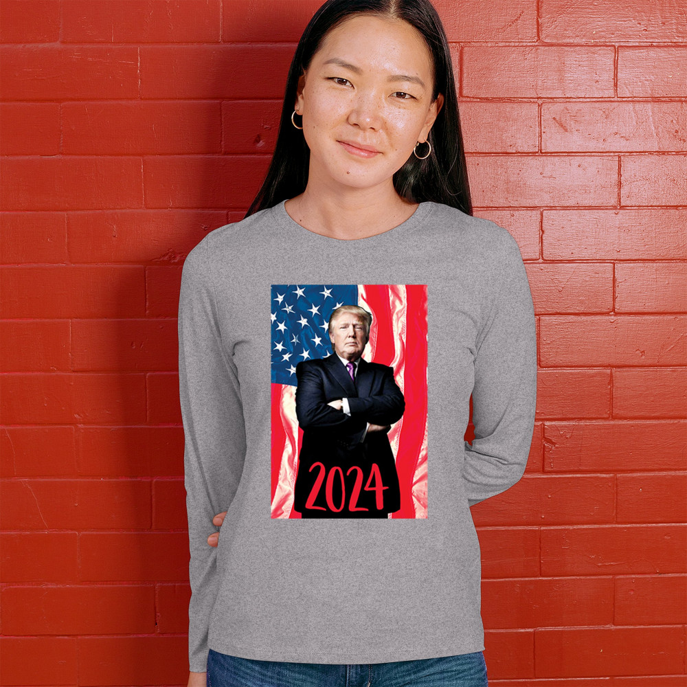Showcase your unwavering support and patriotic pride with our exclusive design, featuring Donald Trump poised before the American flag with "2024" inscribed below. This powerful imagery is a testament to the conservative journey towards victory, echoing the calls of "America First" and unity under a common cause. It's a tribute to those who believe in standing firm, fueled by trust in God and a commitment to the principles that define us. A must-have for every supporter ready to be part of the next chapter in American history.