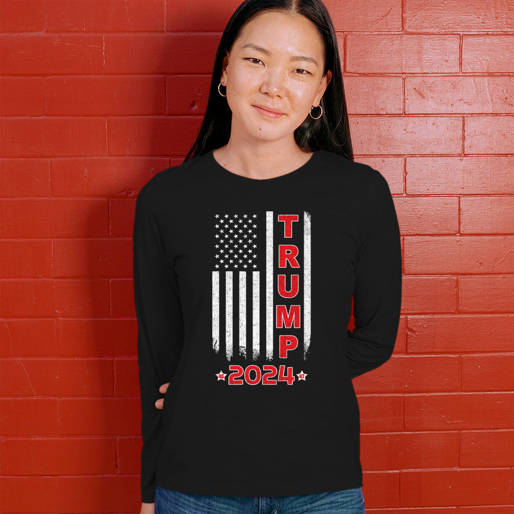 Gear up for the next chapter in American history with our Trump American Flag 2024 design, a bold statement of unwavering support for America First values. Featuring the iconic American flag intertwined with a vintage Trump silhouette, this design is a mu