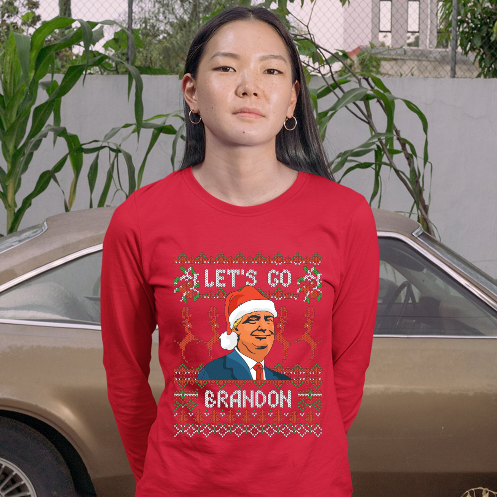 A funny print saying: "Let's Go Brandon" and featuring smiling Donald Trump wearing a Christmas Hat. The print is decorated as a Christmas ugly Sweater. A great choice to wear for a Christmas or New Year's Eve party and entertain your friends!