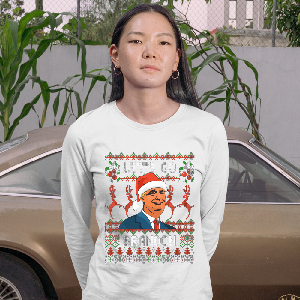 A funny print saying: "Let's Go Brandon" and featuring smiling Donald Trump wearing a Christmas Hat. The print is decorated as a Christmas ugly Sweater. A great choice to wear for a Christmas or New Year's Eve party and entertain your friends!