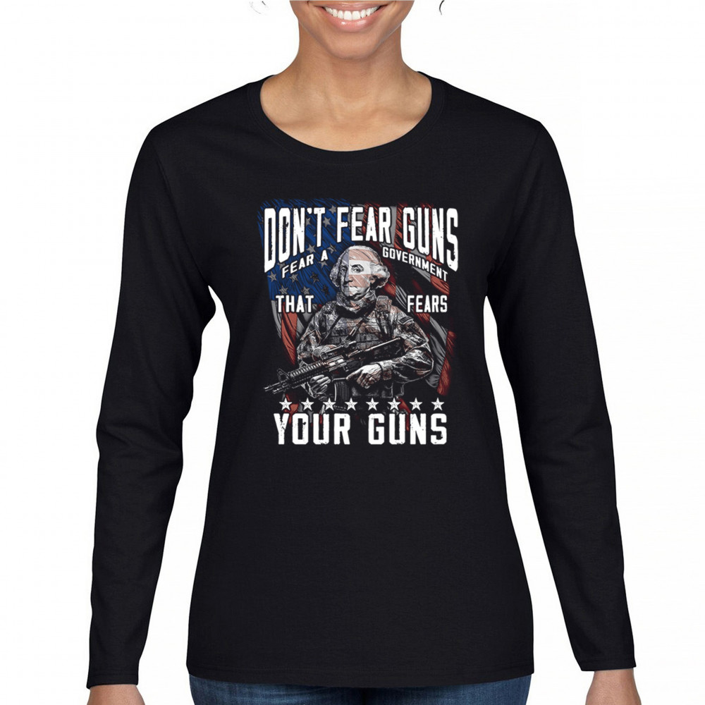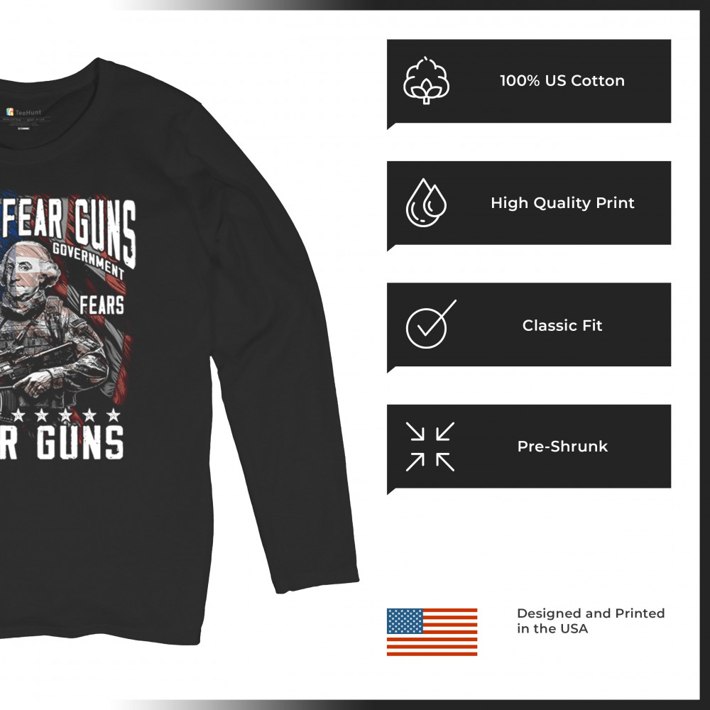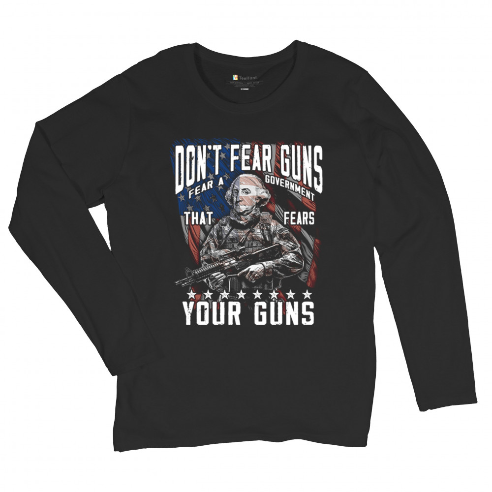 A fierce tribute to liberty, this design shows George Washington armed in tactical gear with the message "Don't Fear Guns, Fear a Government That Fears Your Guns." Perfect for 2nd Amendment patriots, protestors, and anyone who believes in self-defense and personal freedom. A bold, graphic statement for gun rights and political awareness.