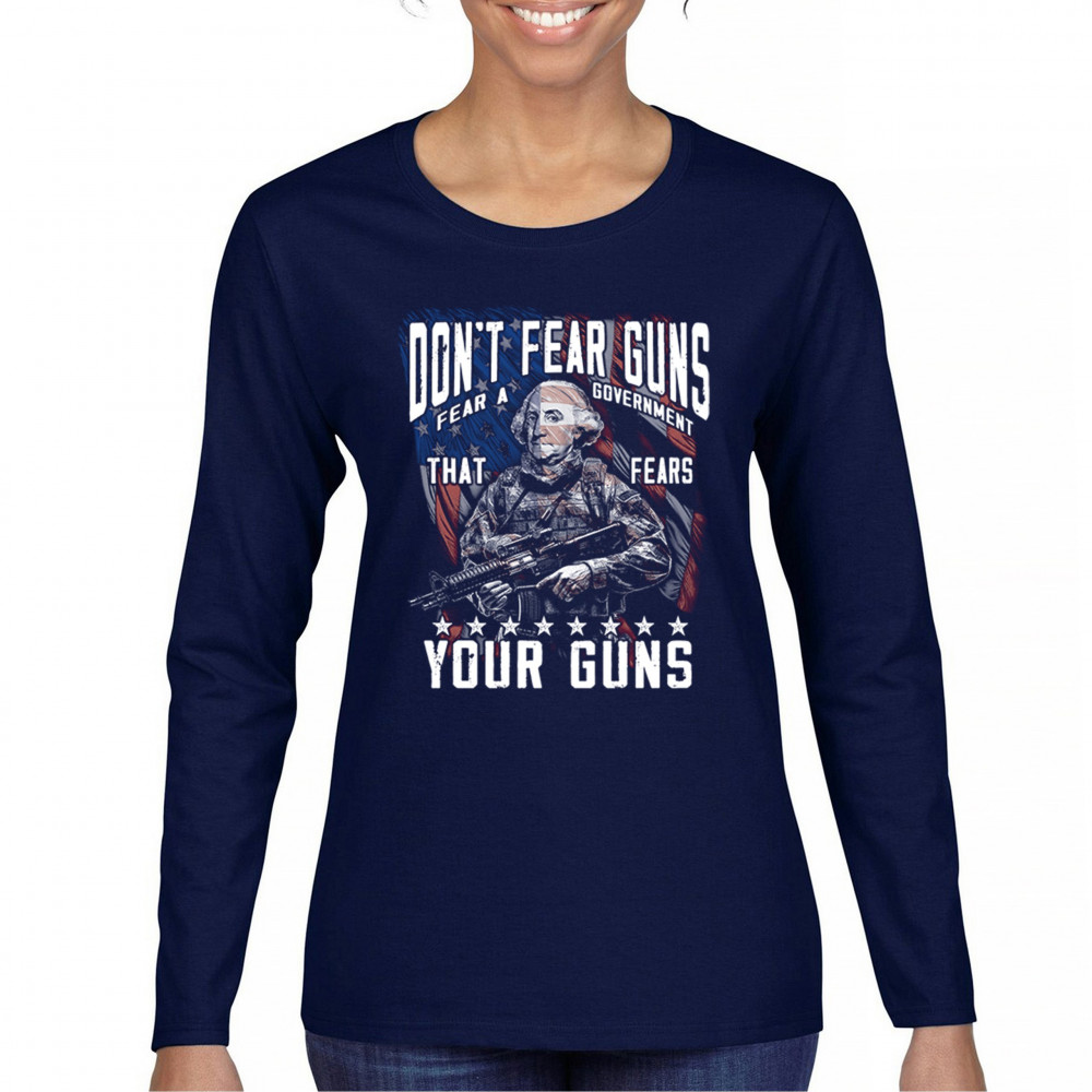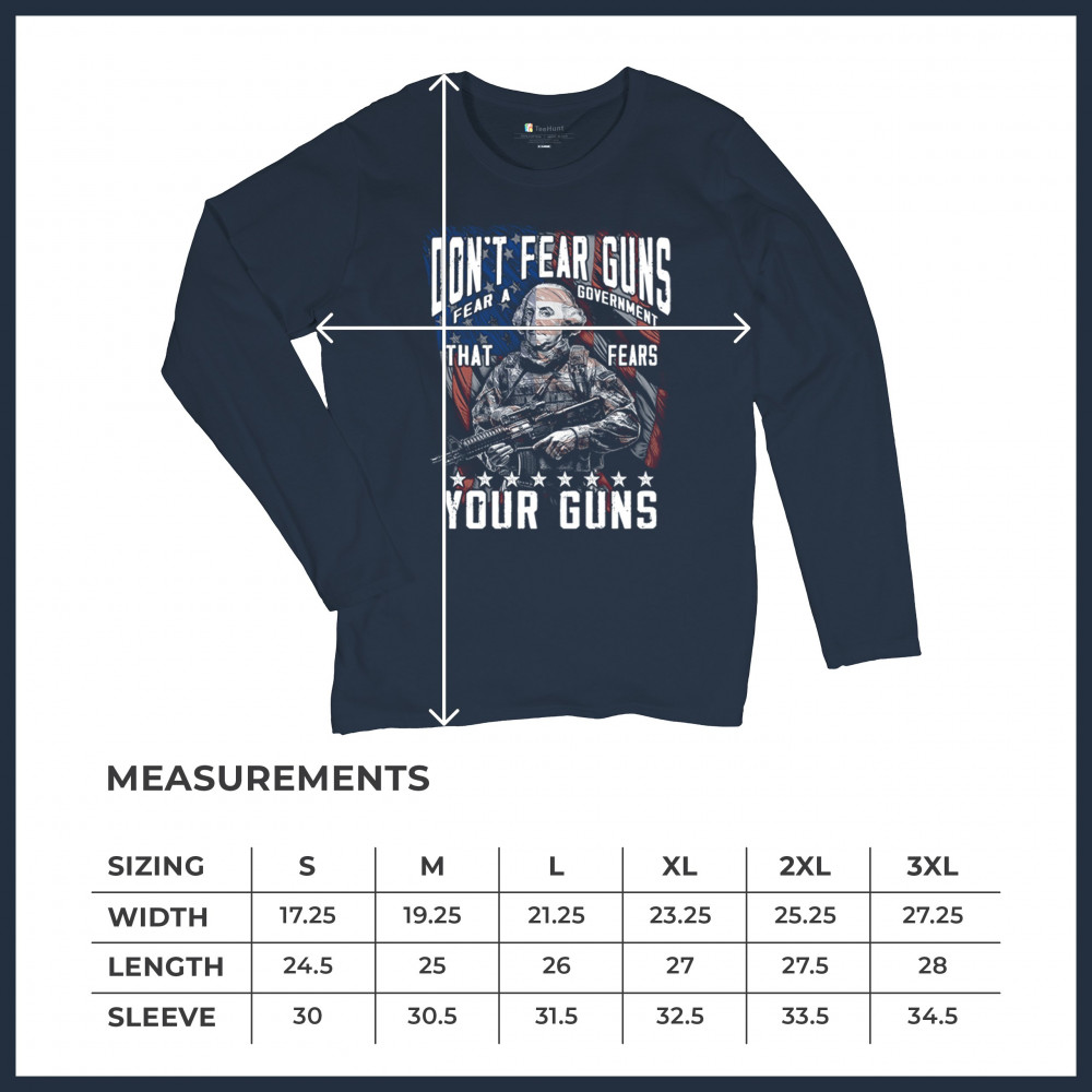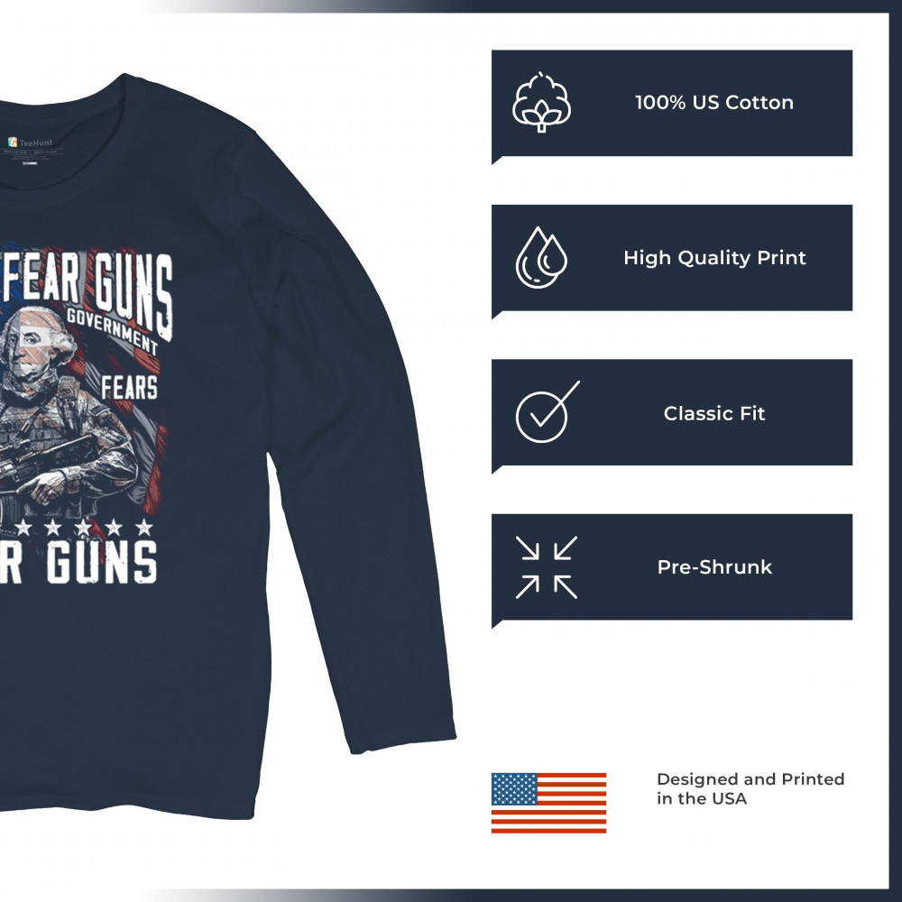 A fierce tribute to liberty, this design shows George Washington armed in tactical gear with the message "Don't Fear Guns, Fear a Government That Fears Your Guns." Perfect for 2nd Amendment patriots, protestors, and anyone who believes in self-defense and personal freedom. A bold, graphic statement for gun rights and political awareness.