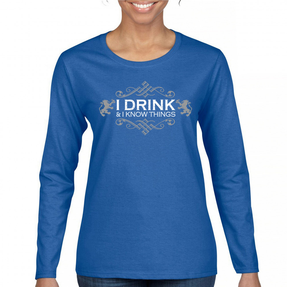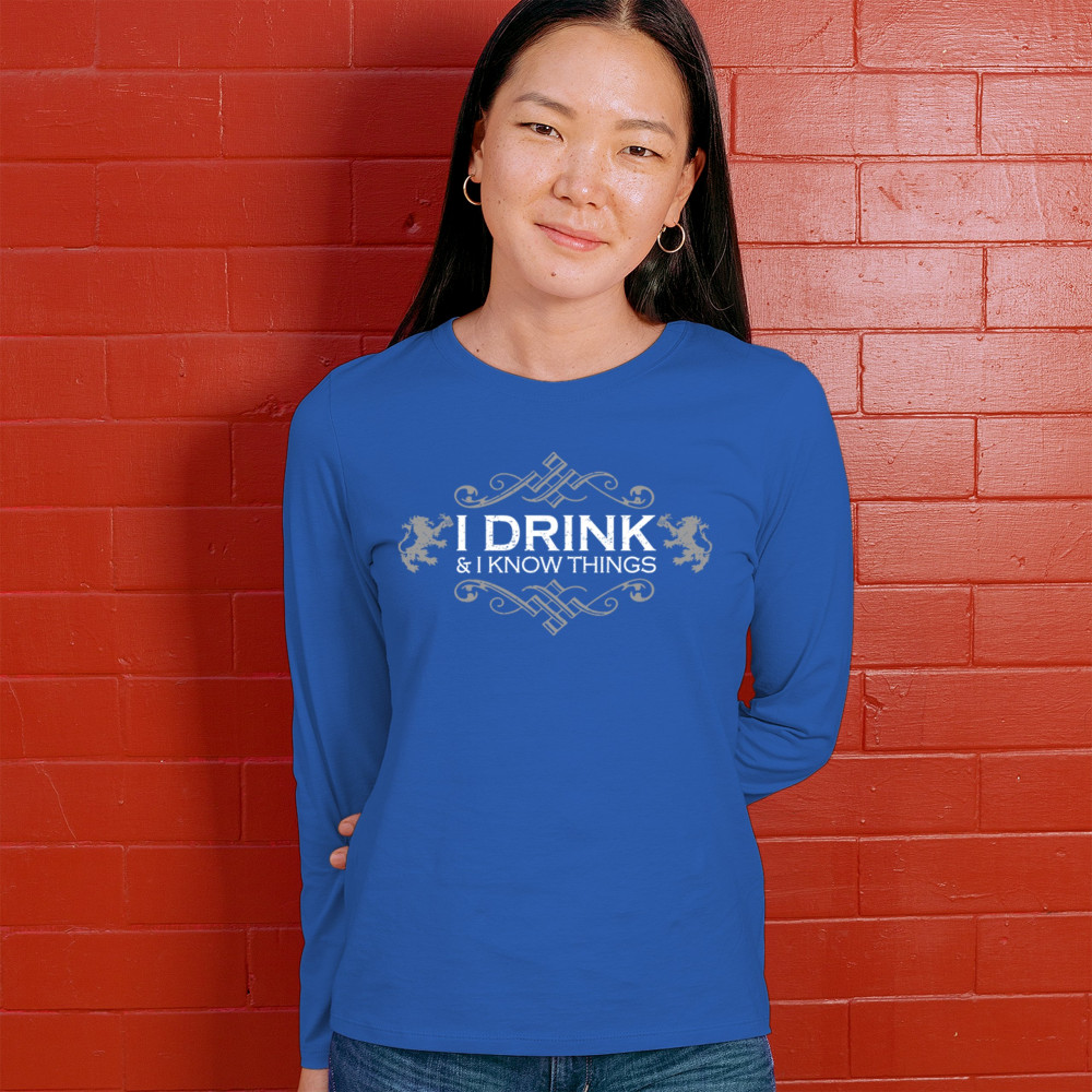Funny fantasy design with “I Drink and I Know Things†quote, perfect for bar nights, humor lovers, trivia kings, and dry sarcasm fans.