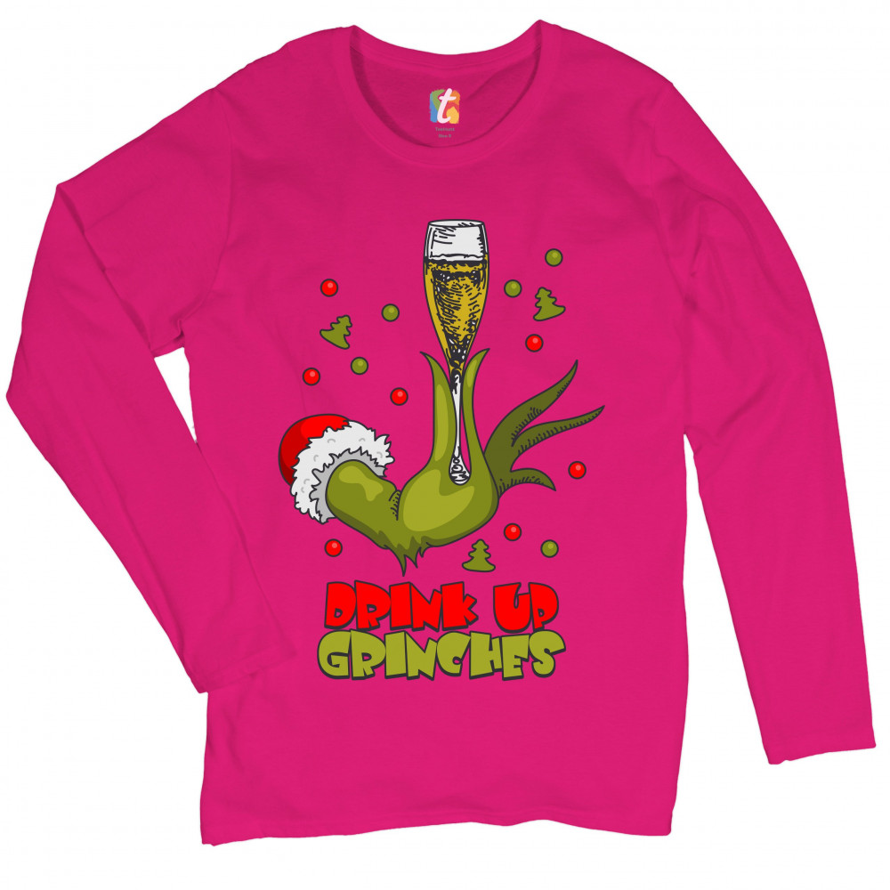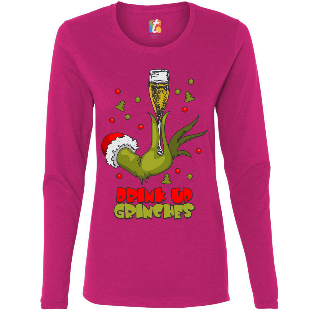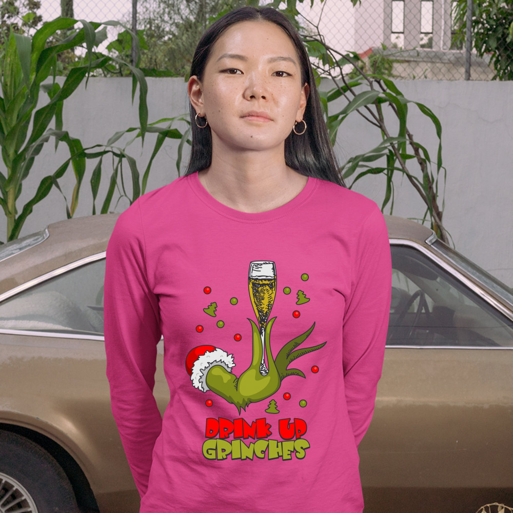 DRINK UP GRINCHES women's long sleeve t-shirt funny christmas drinking pink