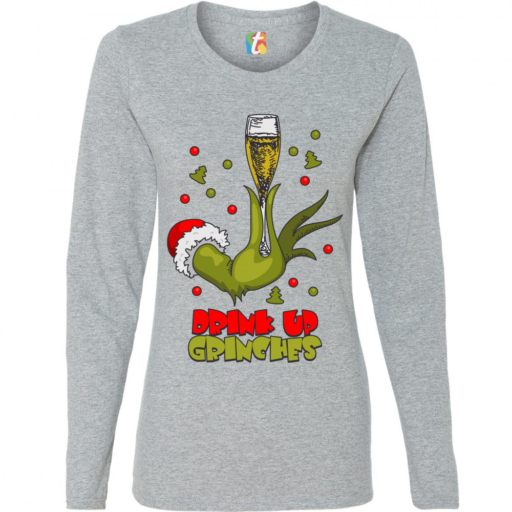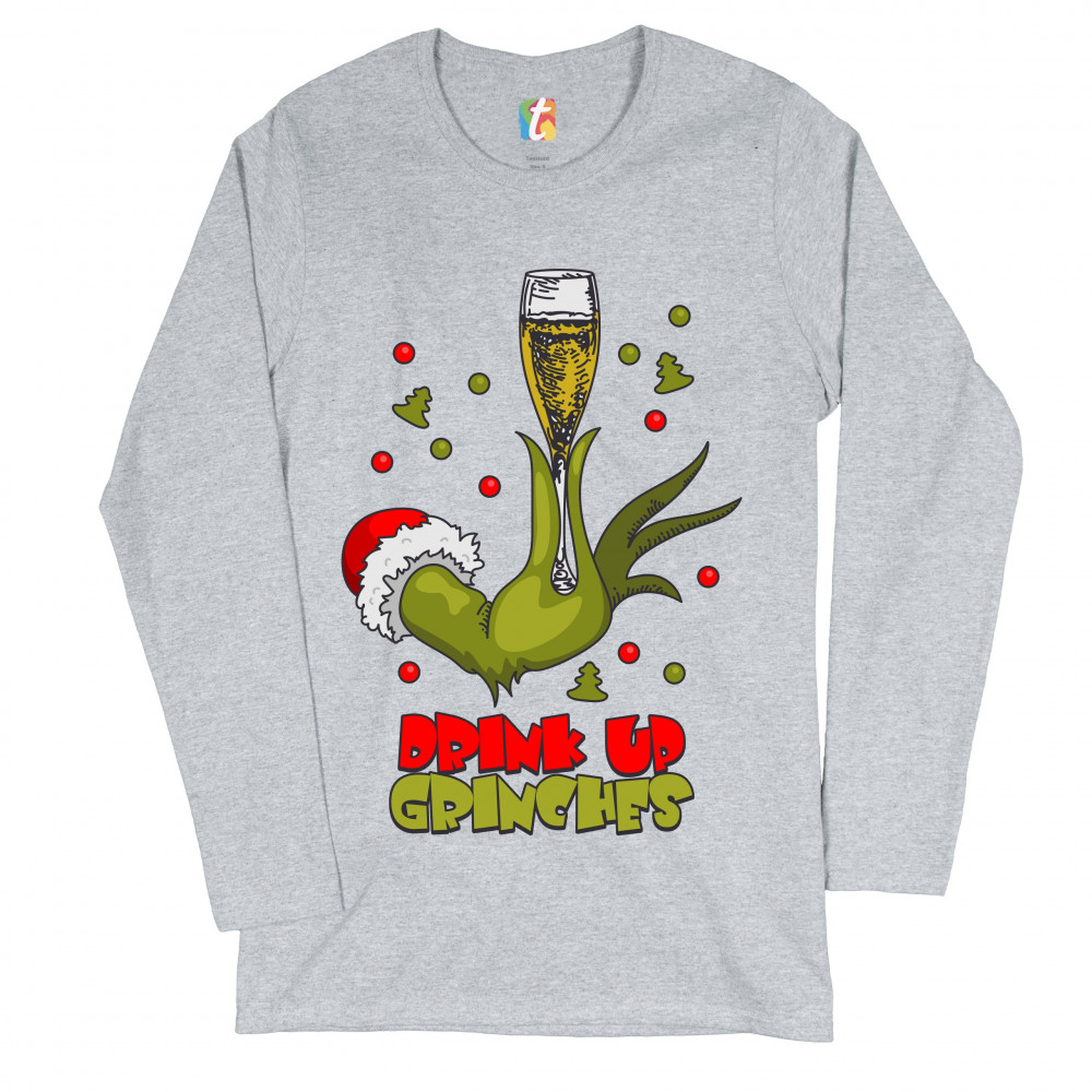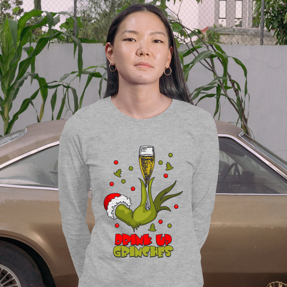 DRINK UP GRINCHES women's long sleeve t-shirt funny christmas drinking gray