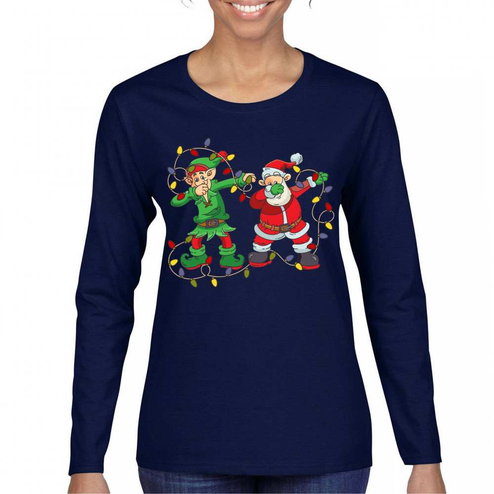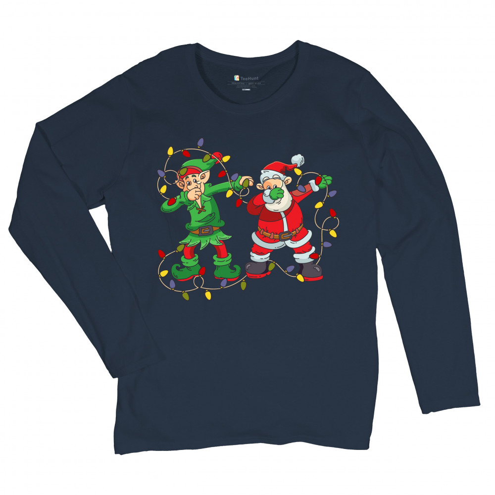 ELF AND SANTA CLAUS DAB DANCING women's long sleeve t-shirt merry christmas navy blue