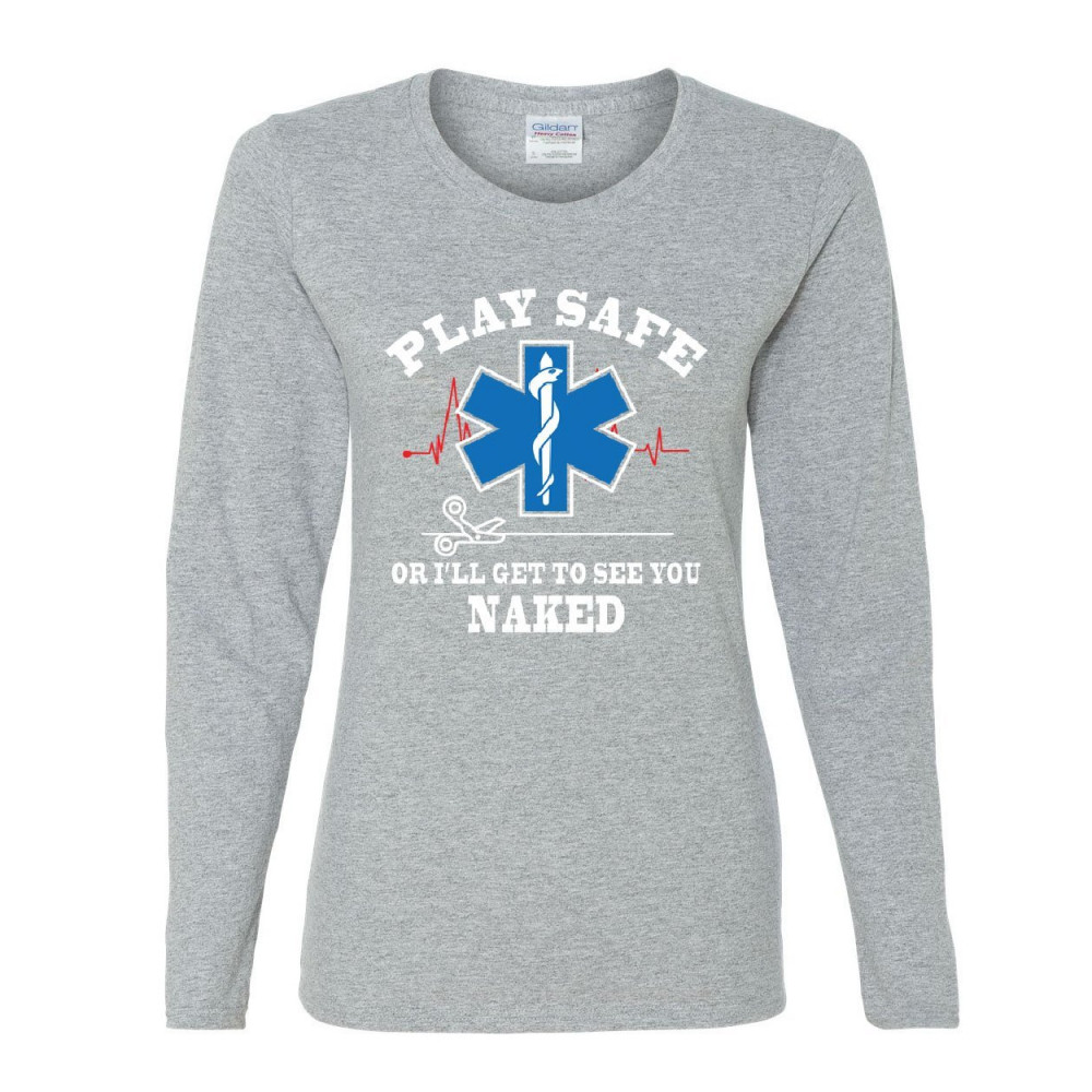 EMS PLAY SAFE OR I'LL GET TO SEE YOU NAKED women's long sleeve tee paramedic gray