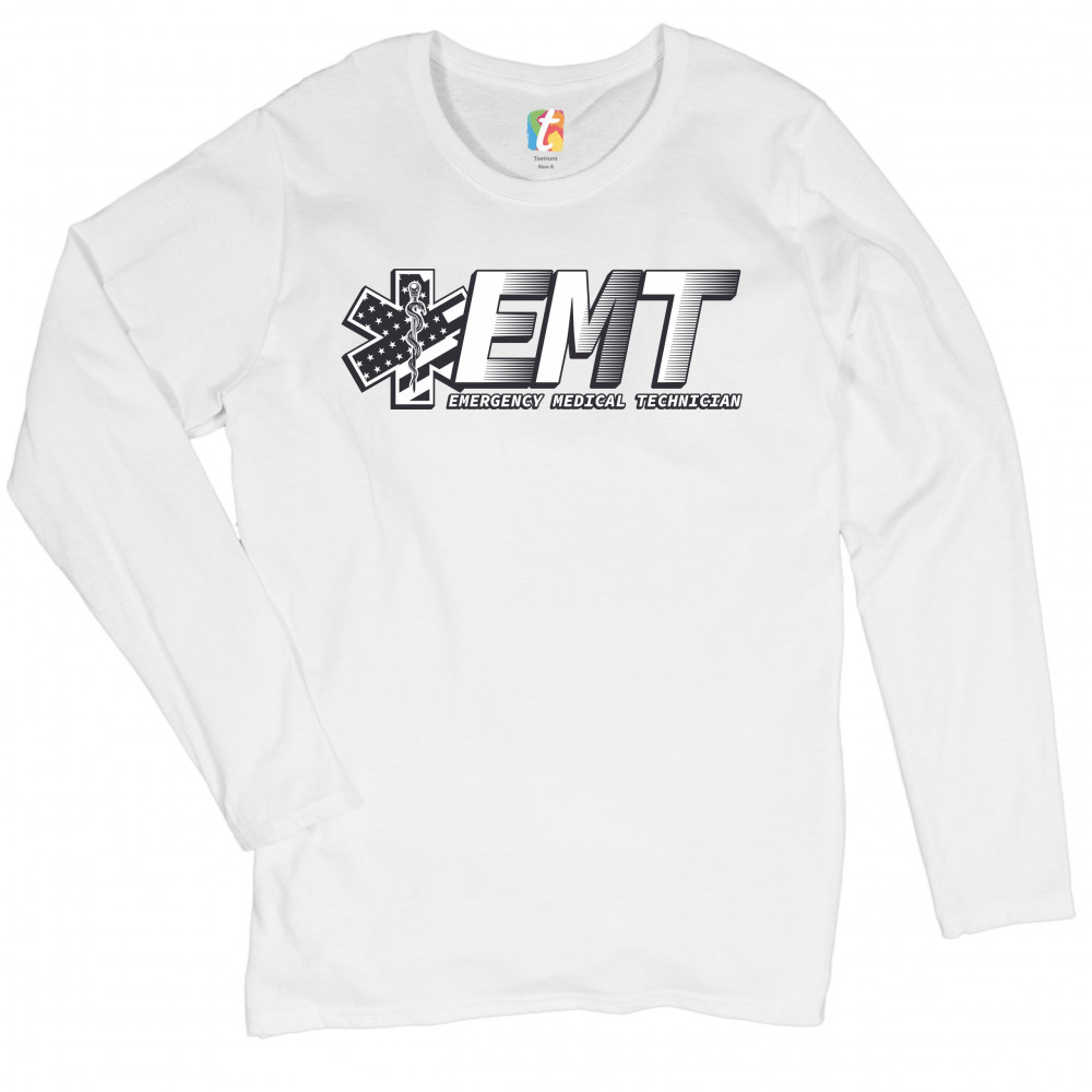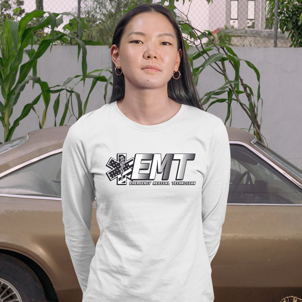A print featuring big letters "EMT" - an abbreviation for "Emergency Medical Technician". On the left side the print features a Star of Life, the worldwide recognized symbol of emergency medical services, with the Rod of Asclepius and Stars and Stripes in