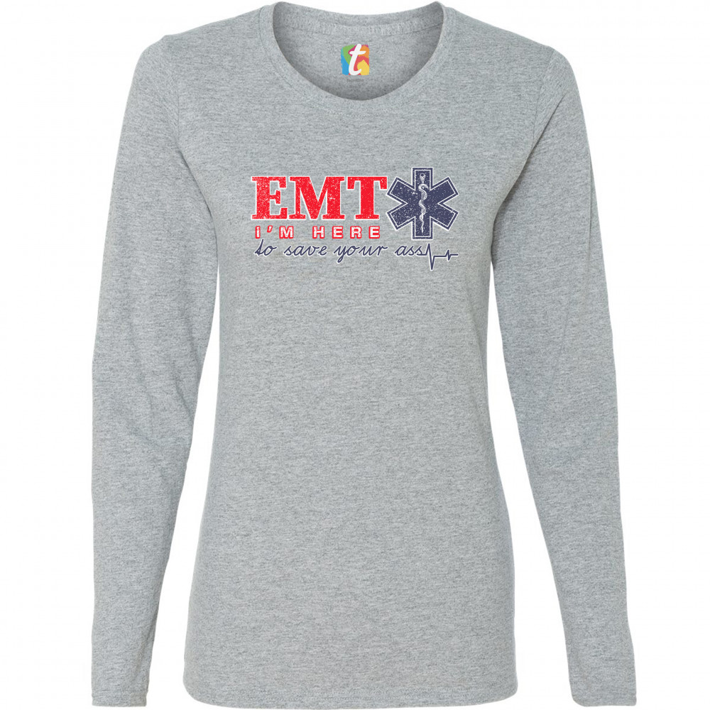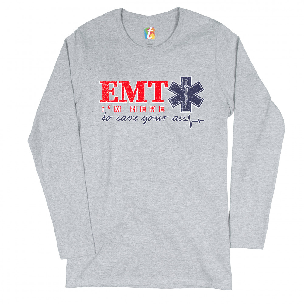 A funny print saying "EMT I'm Here to Save Your Ass". To the right of "EMT" there is the Star of Life, the worldwide recognized symbol of emergency medical services, with the Rod of Asclepius inside of it. A great choice as a gift for a first responder.
