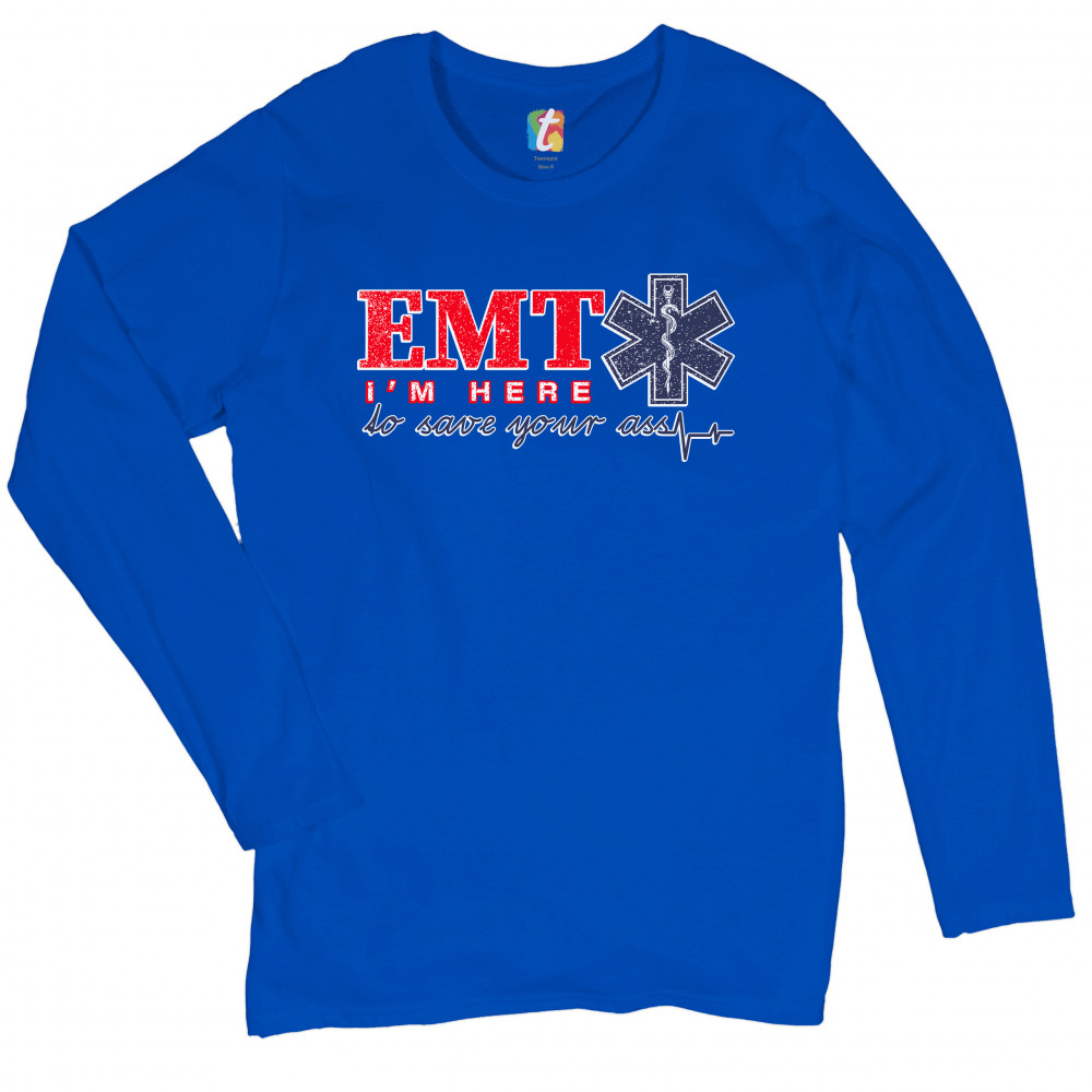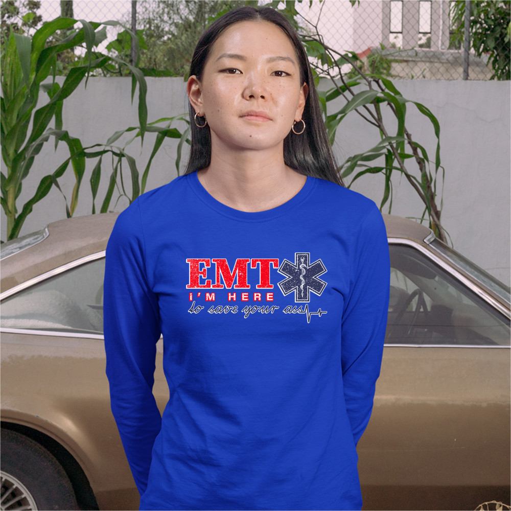 EMT I'M HERE TO SAVE YOUR ASS women's long sleeve t-shirt ems medical assistant royal blue