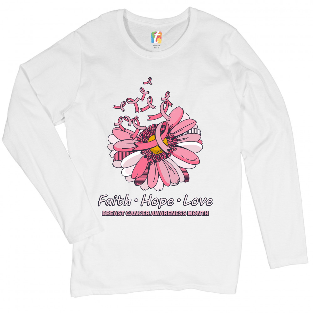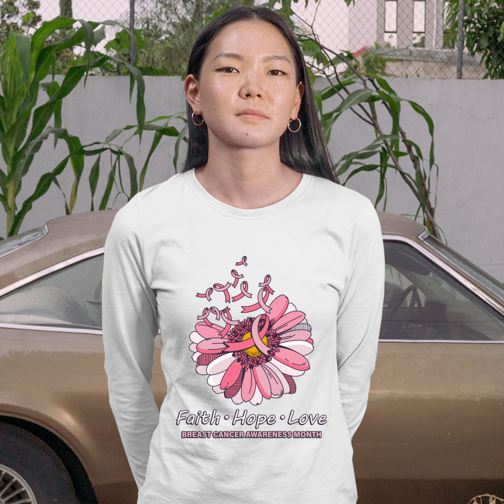 A print featuring a big flower with several petals missing and numerous pink ribbons flying away from it. The print says: "Faith Hope Love" and "Breast Cancer Awareness Month". Wear it to spread awareness abouth the disease and support a person you know w