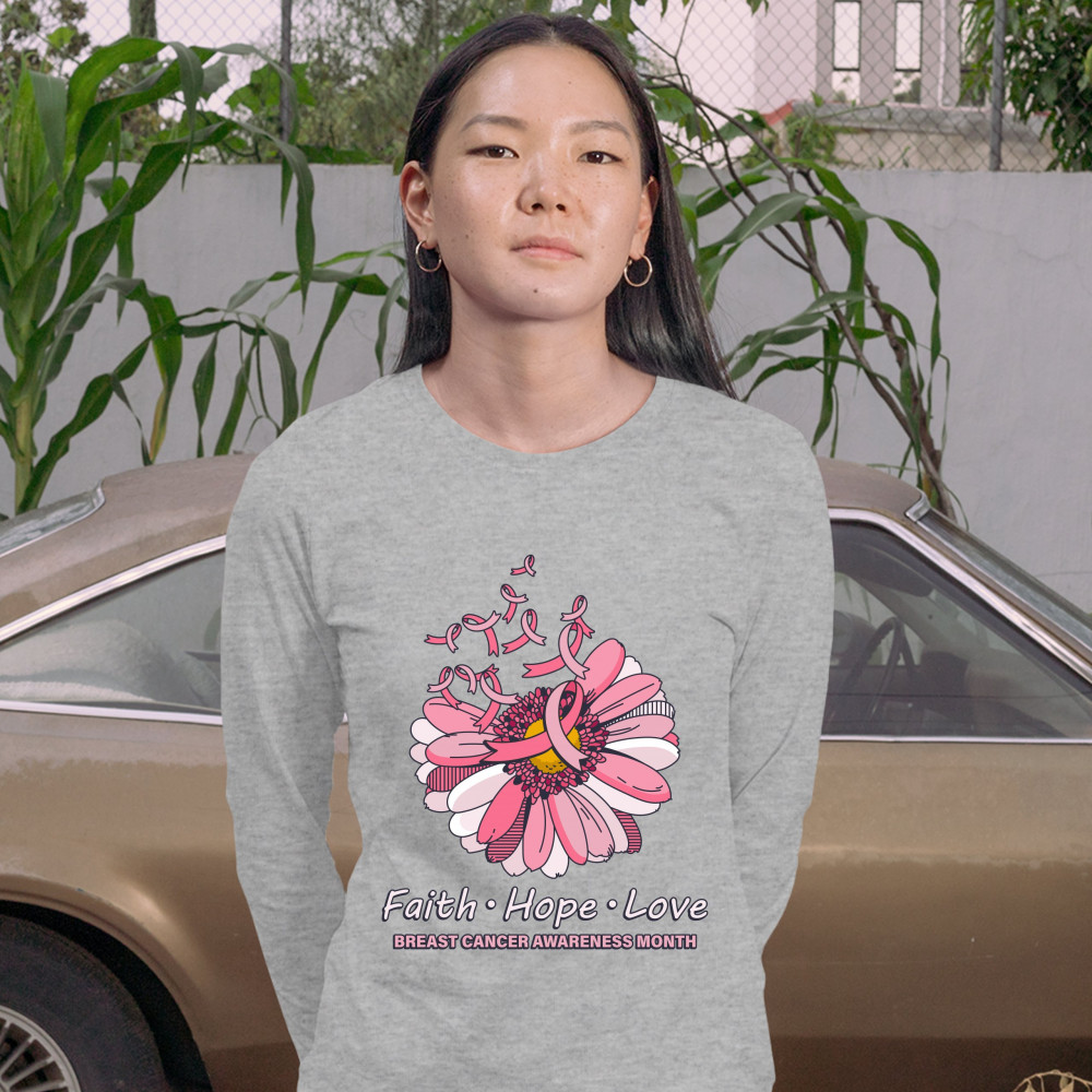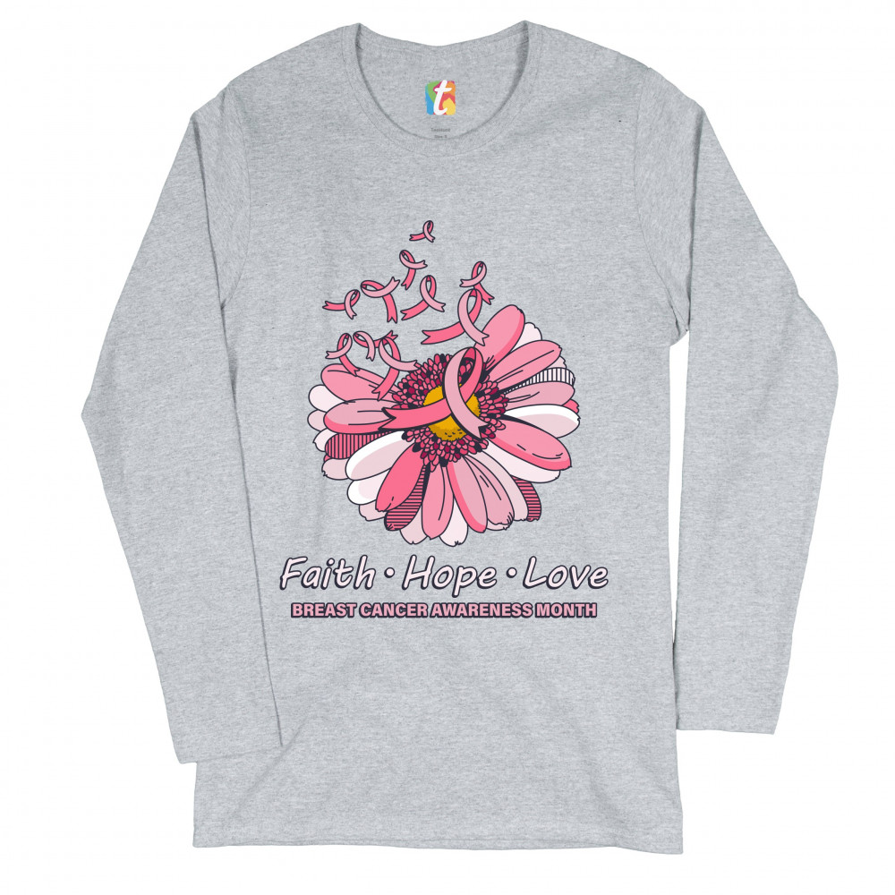 A print featuring a big flower with several petals missing and numerous pink ribbons flying away from it. The print says: "Faith Hope Love" and "Breast Cancer Awareness Month". Wear it to spread awareness abouth the disease and support a person you know w