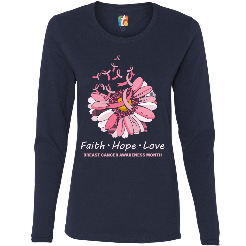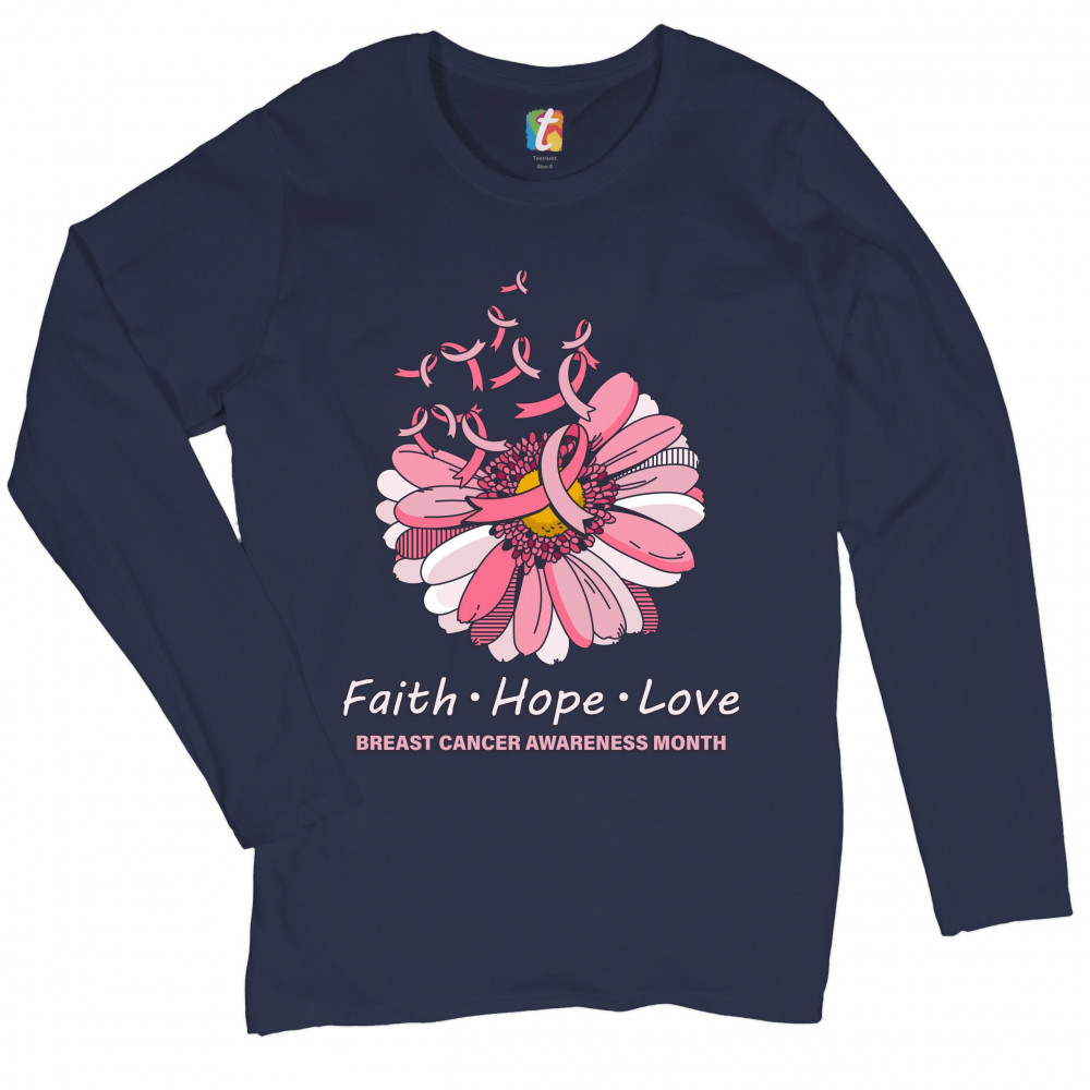 A print featuring a big flower with several petals missing and numerous pink ribbons flying away from it. The print says: "Faith Hope Love" and "Breast Cancer Awareness Month". Wear it to spread awareness abouth the disease and support a person you know w