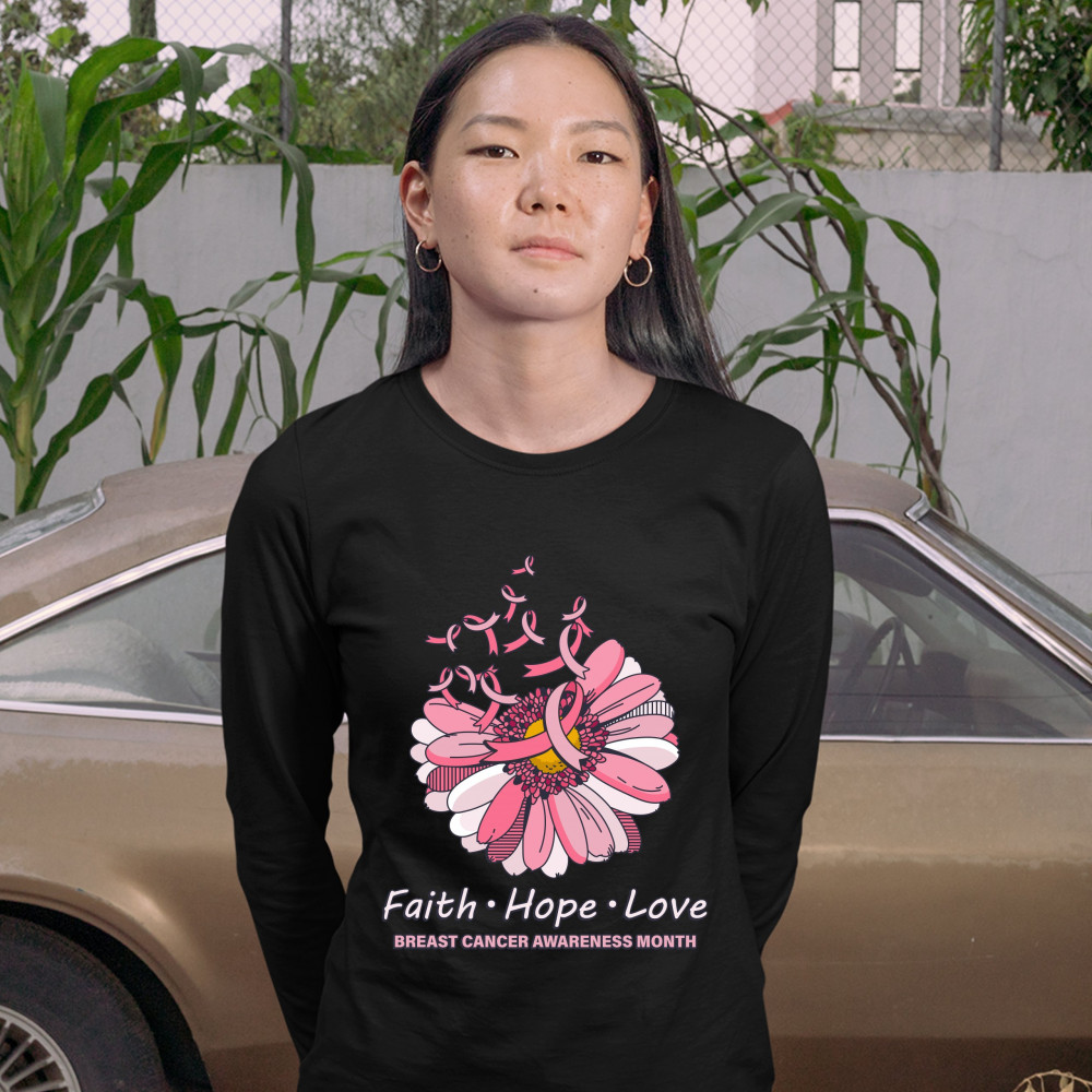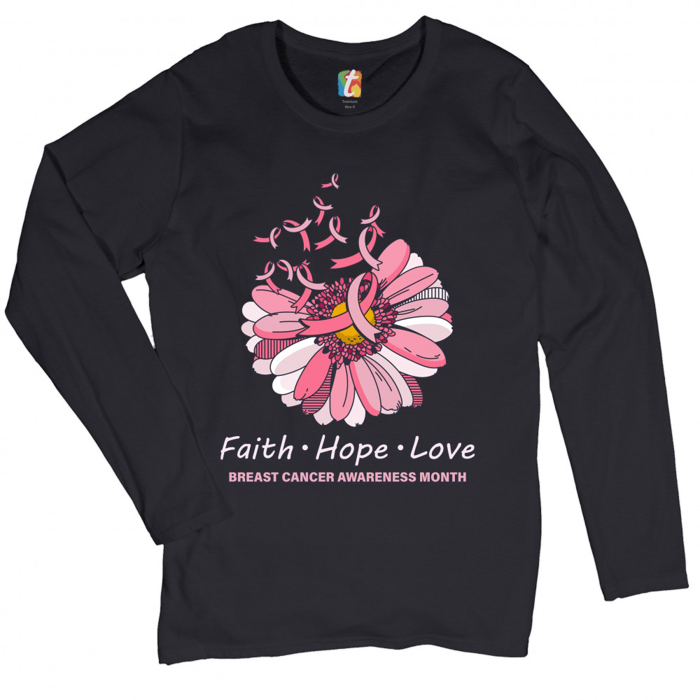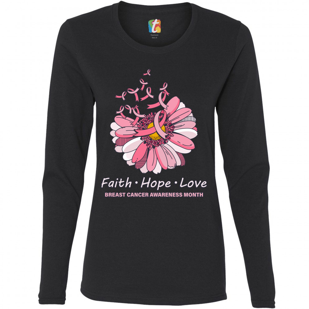 FAITH HOPE LOVE women's long sleeve t-shirt breast cancer awareness month black