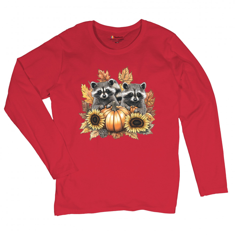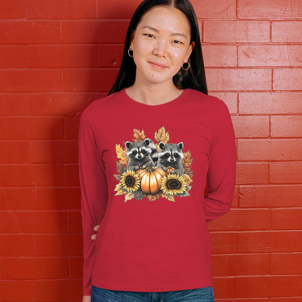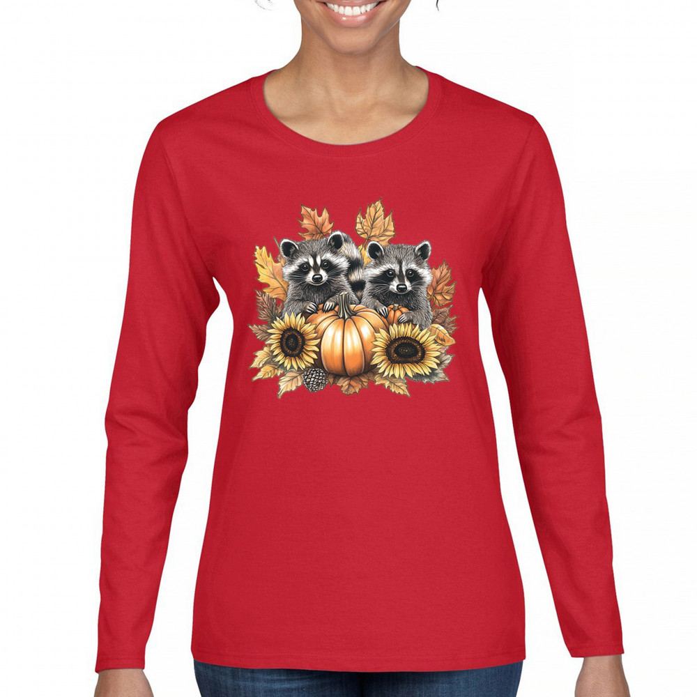 Rustic autumn raccoon design with pumpkins and sunflowers. Perfect for Thanksgiving, pumpkin patch days, farmhouse harvest, and woodland fall fashion.