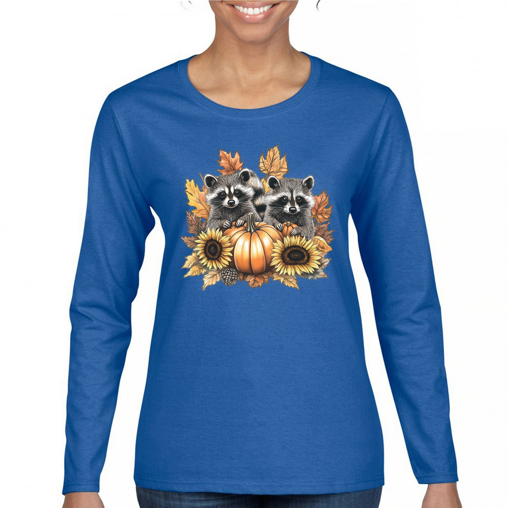 Rustic autumn raccoon design with pumpkins and sunflowers. Perfect for Thanksgiving, pumpkin patch days, farmhouse harvest, and woodland fall fashion.