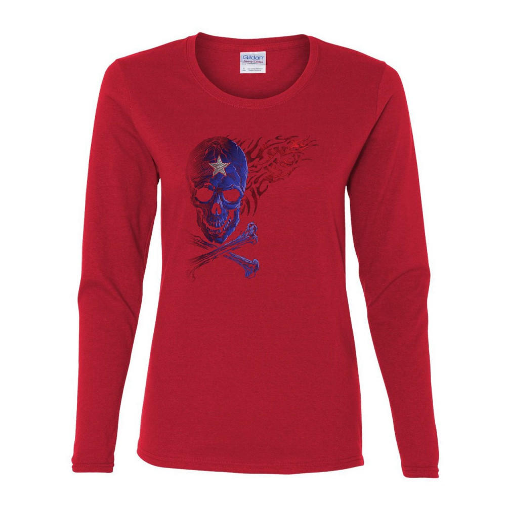 SKULL FACE WITH CROSSBONES fantacycle skull crossbones women's long sleeve tee american pride tribal flame red