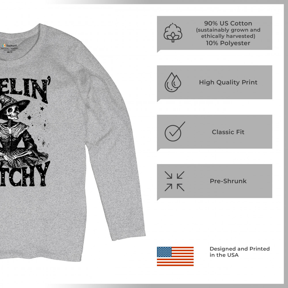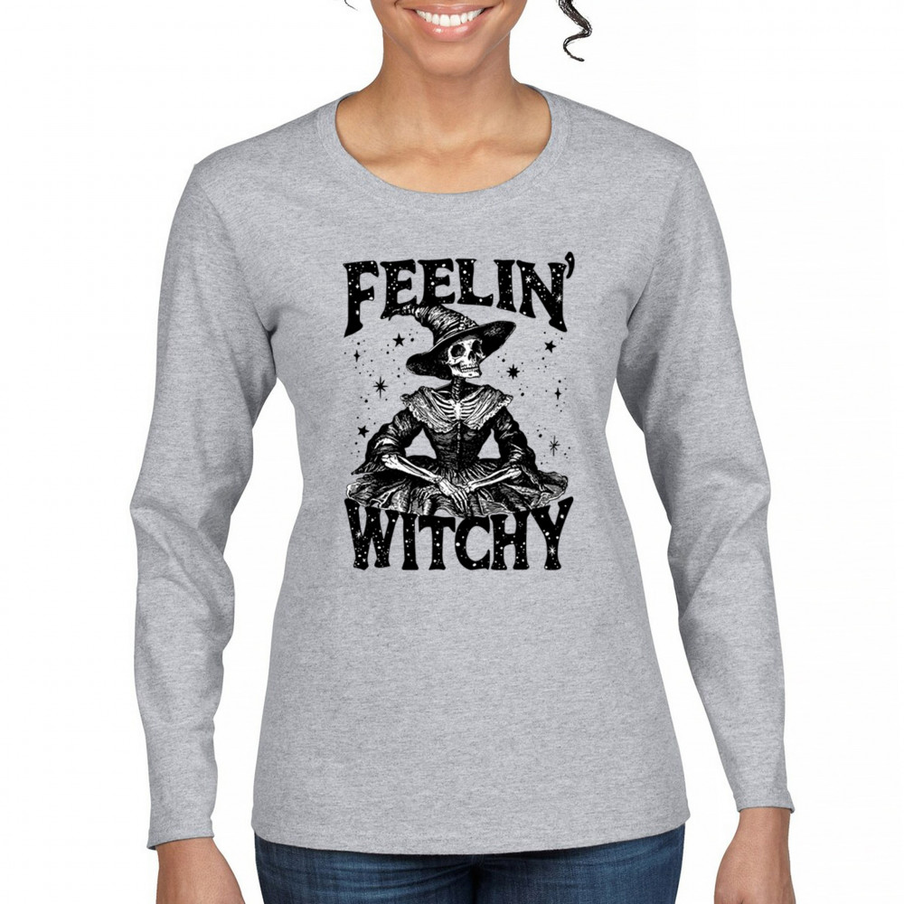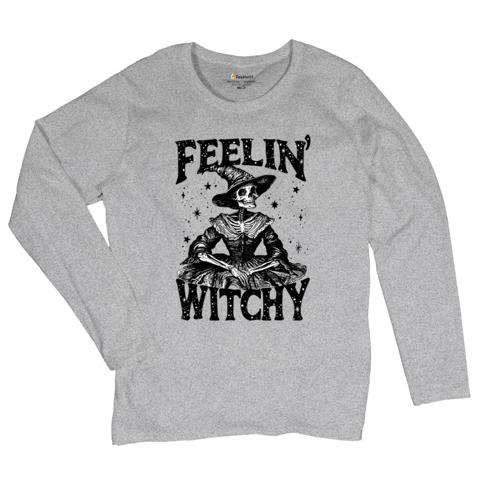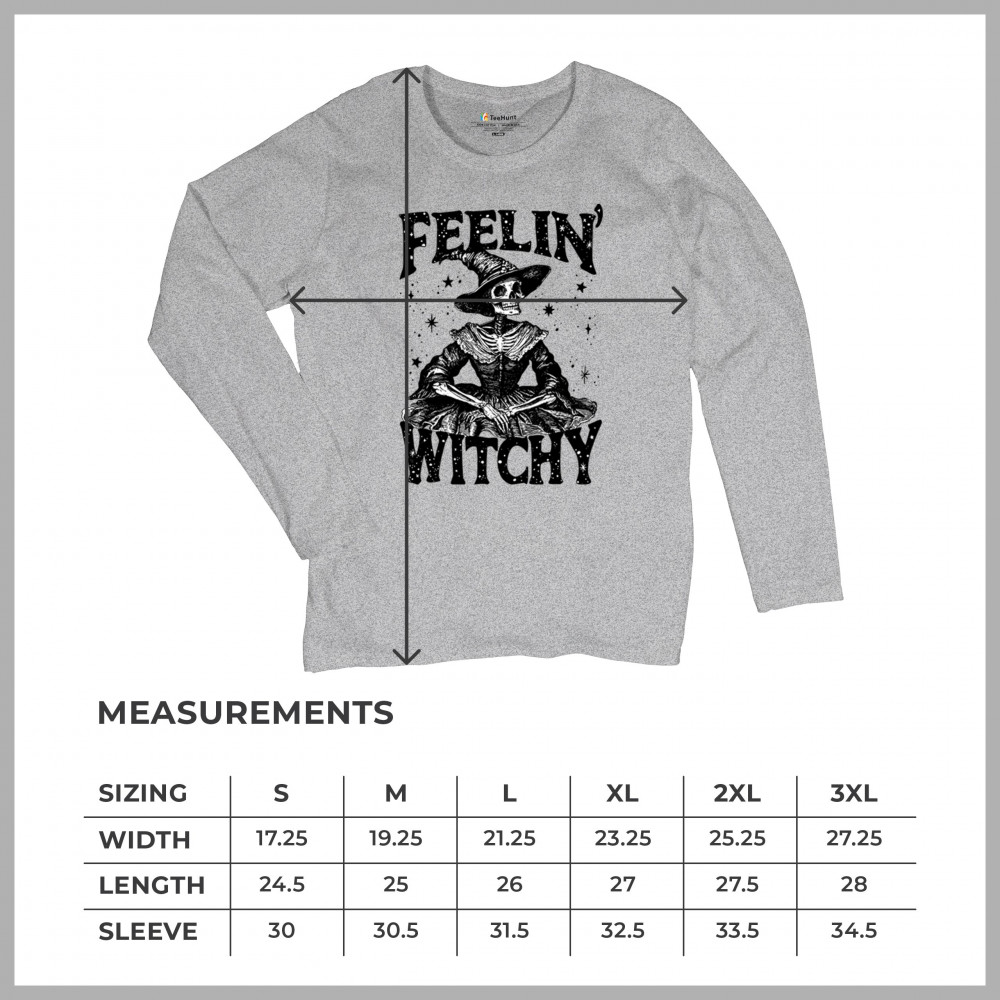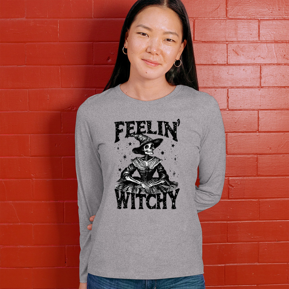 Add a touch of enchantment to your wardrobe with this "Feelin' Witchy" design. Perfect for Halloween, themed parties, or everyday wear, this piece captures gothic aesthetics with playful charm. Featuring a skeleton dressed as a witch, it celebrates the lighter side of spooky fashion. Ideal for those who enjoy blending whimsy with the supernatural, it's a must-have for the season.