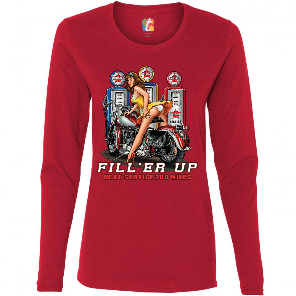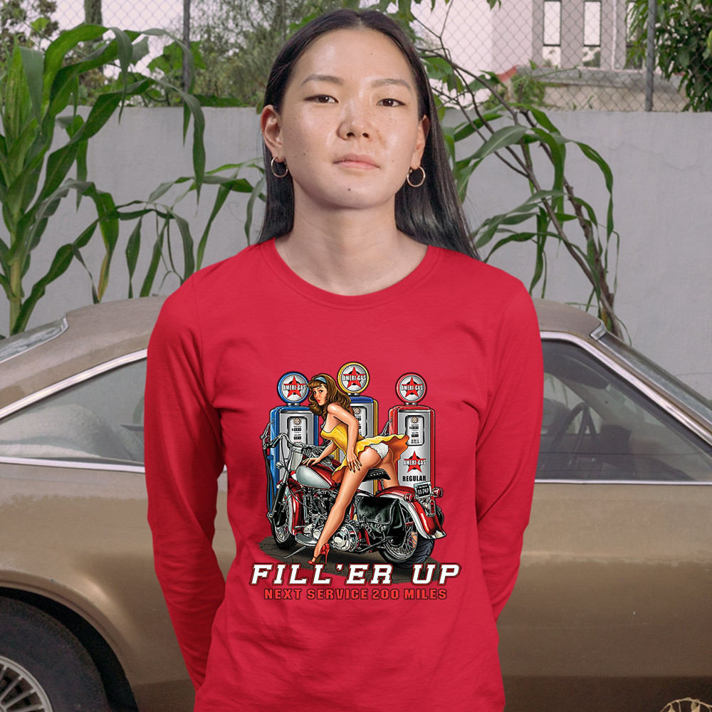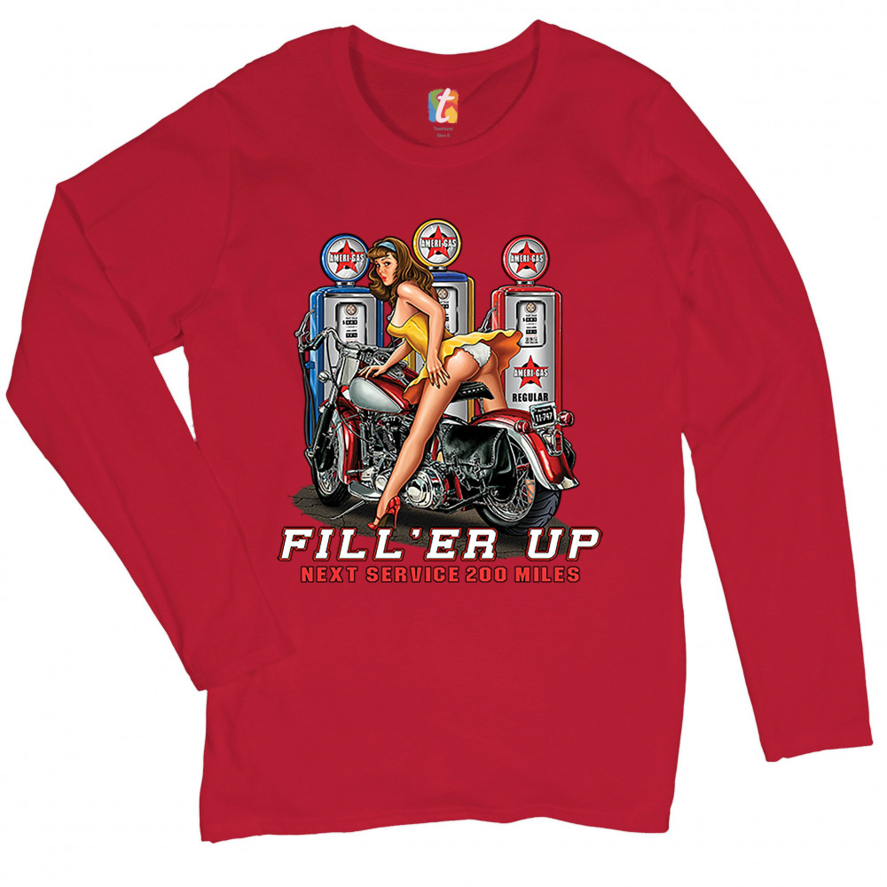 FILL 'ER UP women's long sleeve t-shirt sexy pin-up girl biker live to ride red