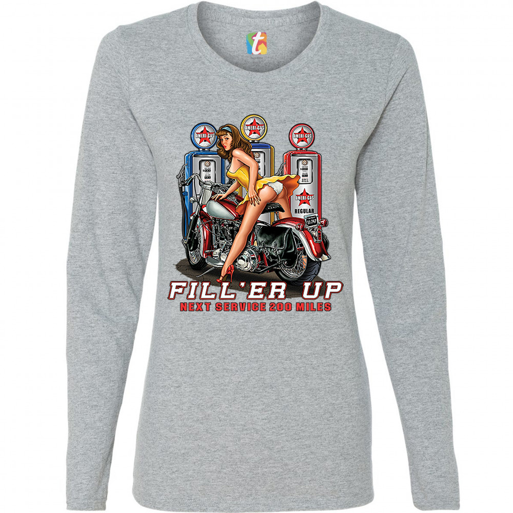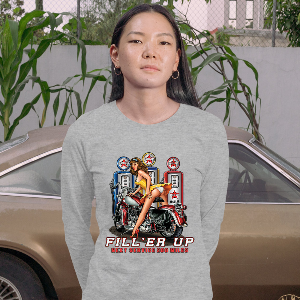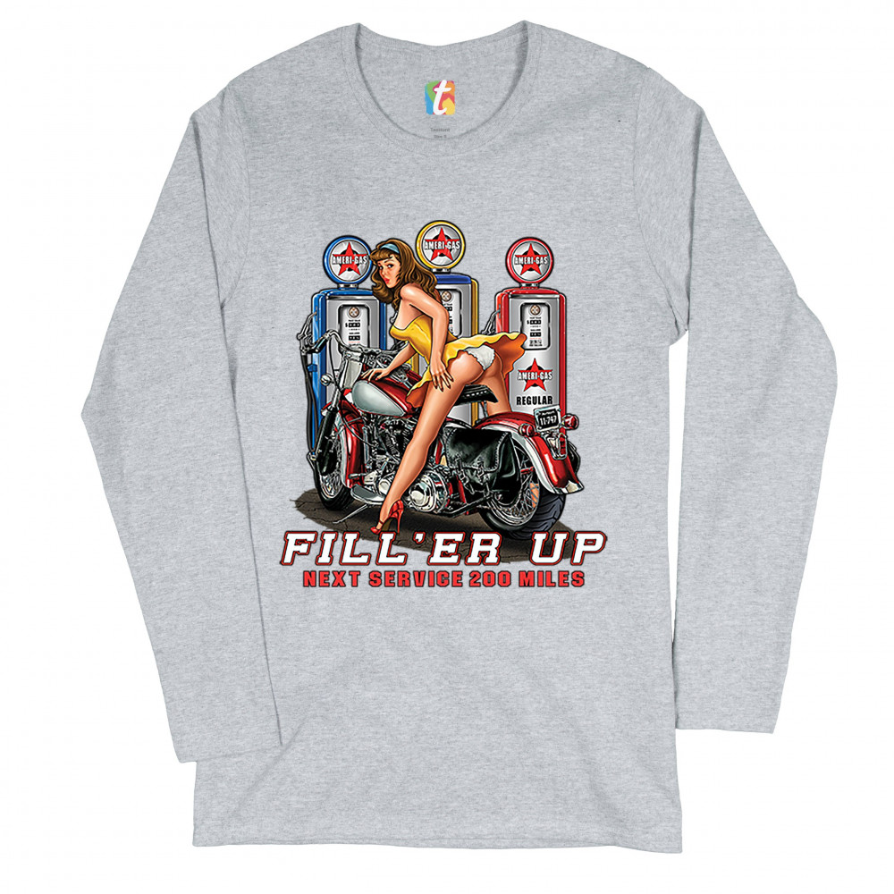 FILL 'ER UP women's long sleeve t-shirt sexy pin-up girl biker live to ride gray