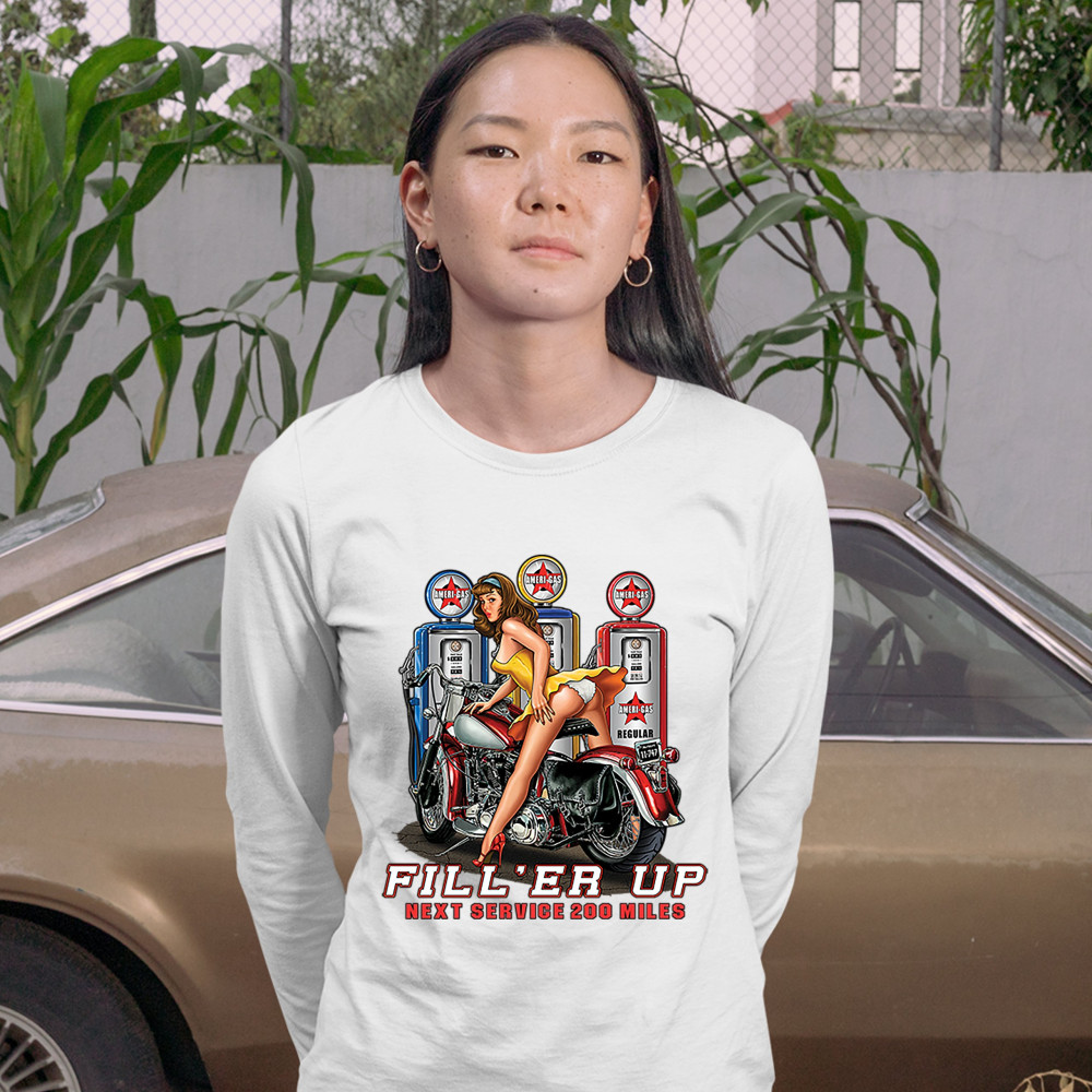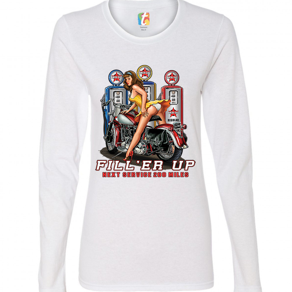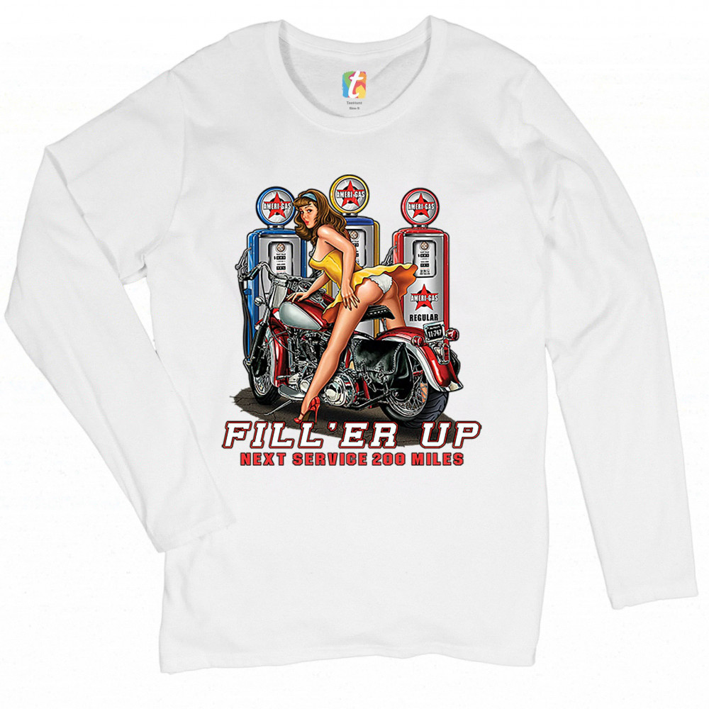 FILL 'ER UP women's long sleeve t-shirt sexy pin-up girl biker live to ride white