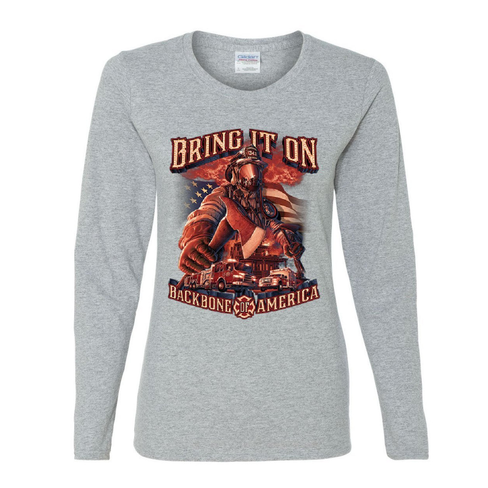 FIREFIGHTER BACKBONE OF AMERICA women's long sleeve tee fd fire and rescue hero gray