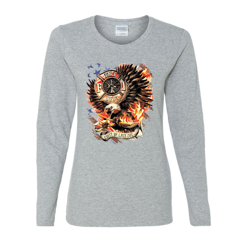 FIREFIGHTER FIRST IN LAST OUT first in last out women's long sleeve tee fire & rescue fd american firefighter gray