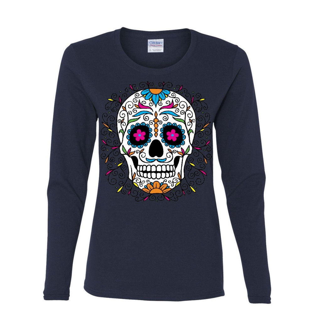 FLORAL SUGAR SKULL DAY OF THE DEAD long sleeve t-shirt calavera navy blue