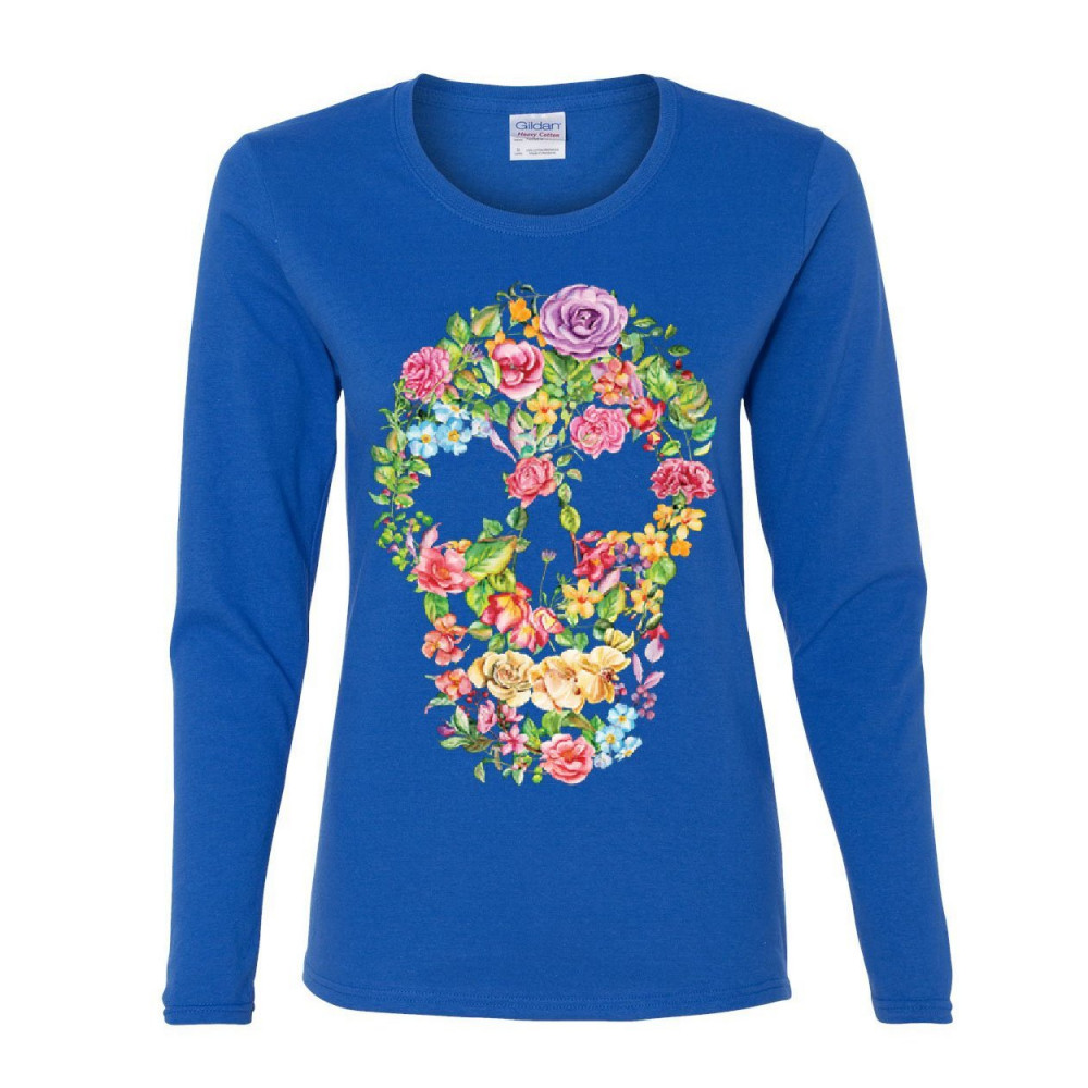 FLOWER SKULL women's long sleeve tee sugar skull calavera dia de los muertos royal blue